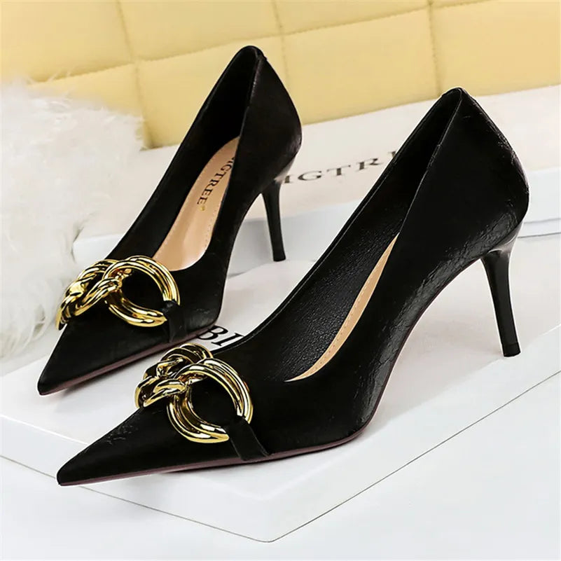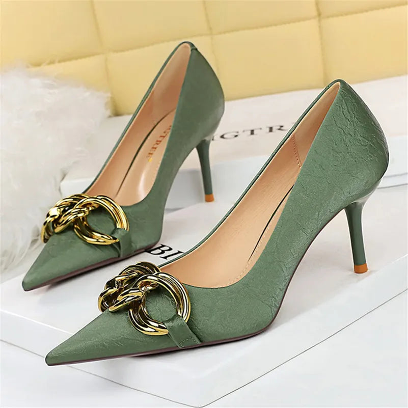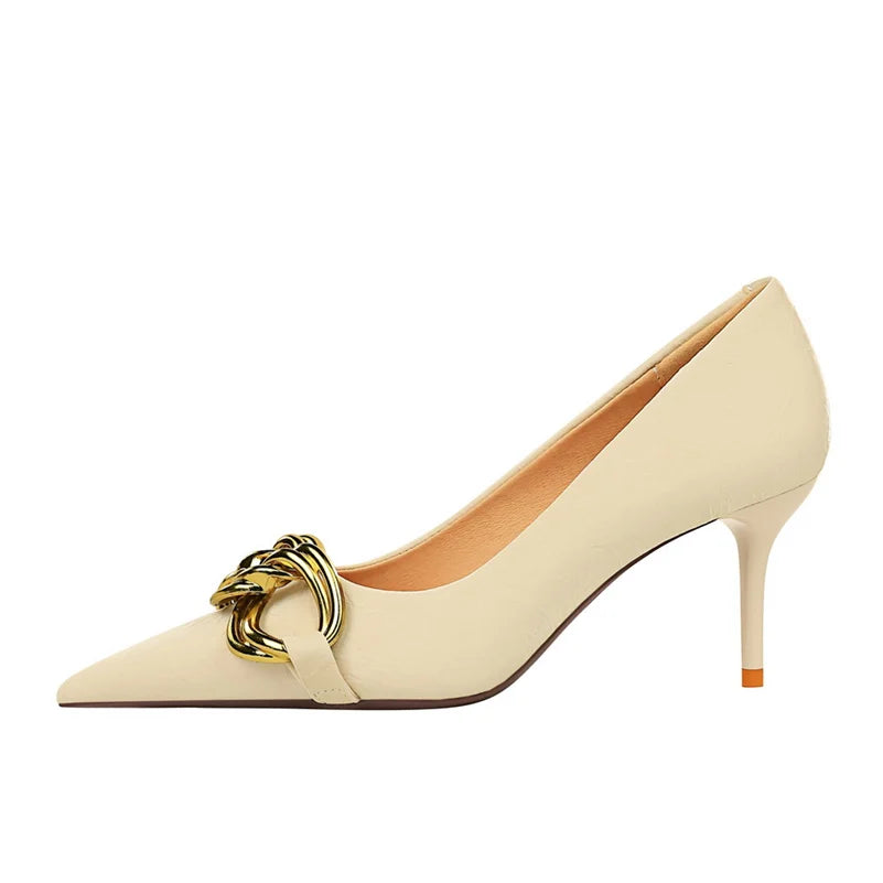 These All Of The Girls Stilletos feature a sleek, pointed toe and a super high 8cm+ heel for an elegant, elevated look. Each shoe is crafted from high-quality PU upper material, PU Insole and Lining, rubber outsole, and a stylish, secure chain decoration. The platform is 0-3cm for added stability. Slip On closure for easy wear.