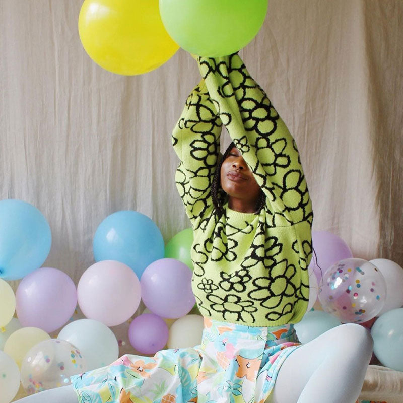 Bold Contrast Floral Bishop Sleeve Rib Knit Oversized Sweater - Green