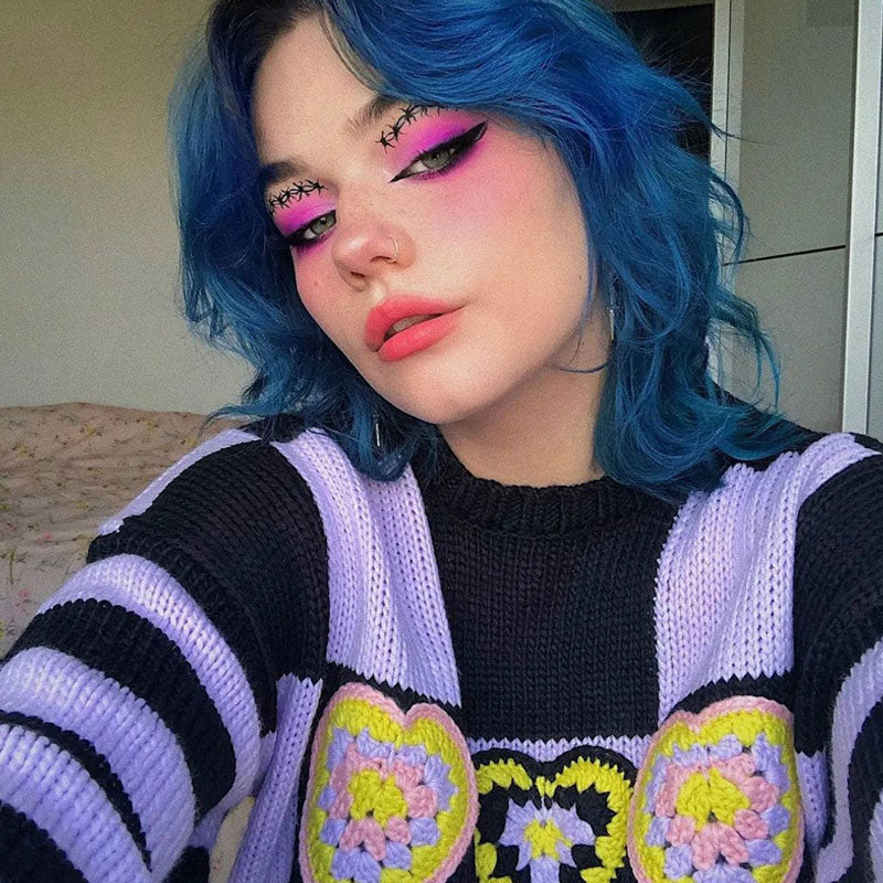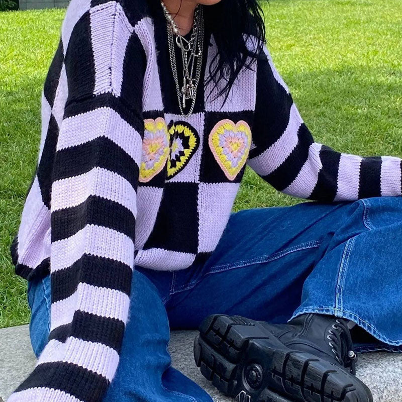 Chic Heart Checkered Drop Shoulder Long Sleeve Sweater - Purple