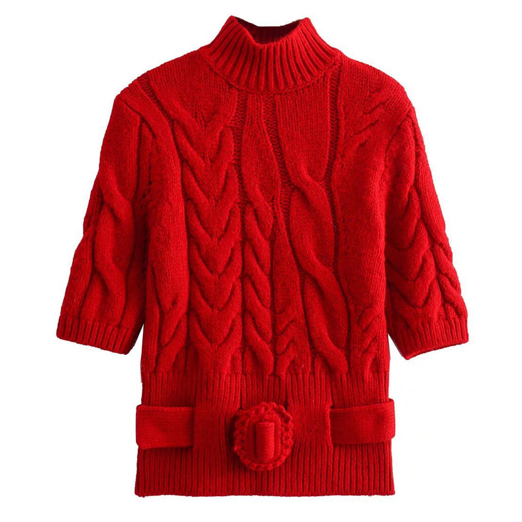 Classic High Neck Half Sleeve Belted Chunky Cable Knit Pullover Sweater