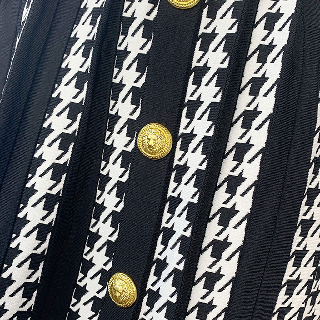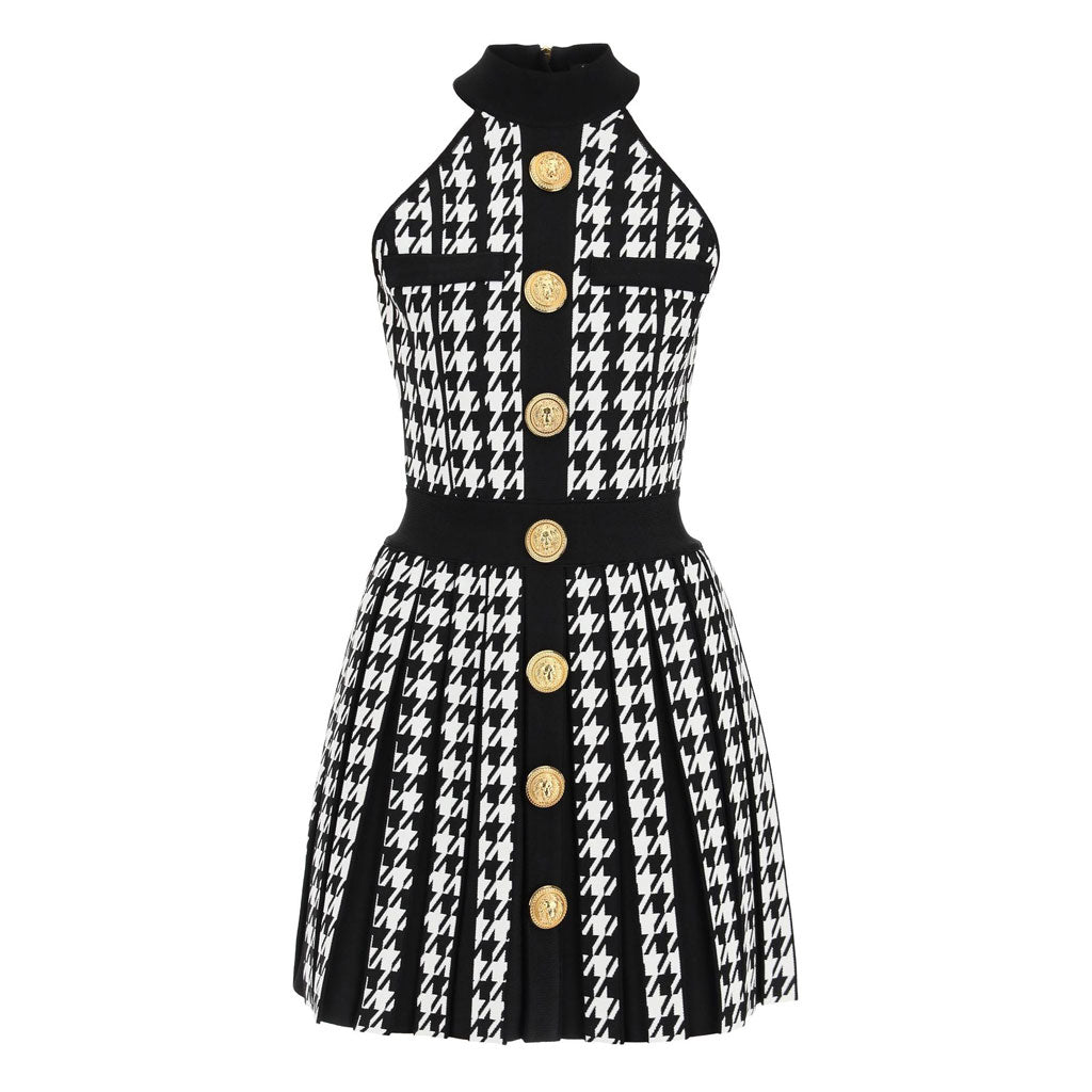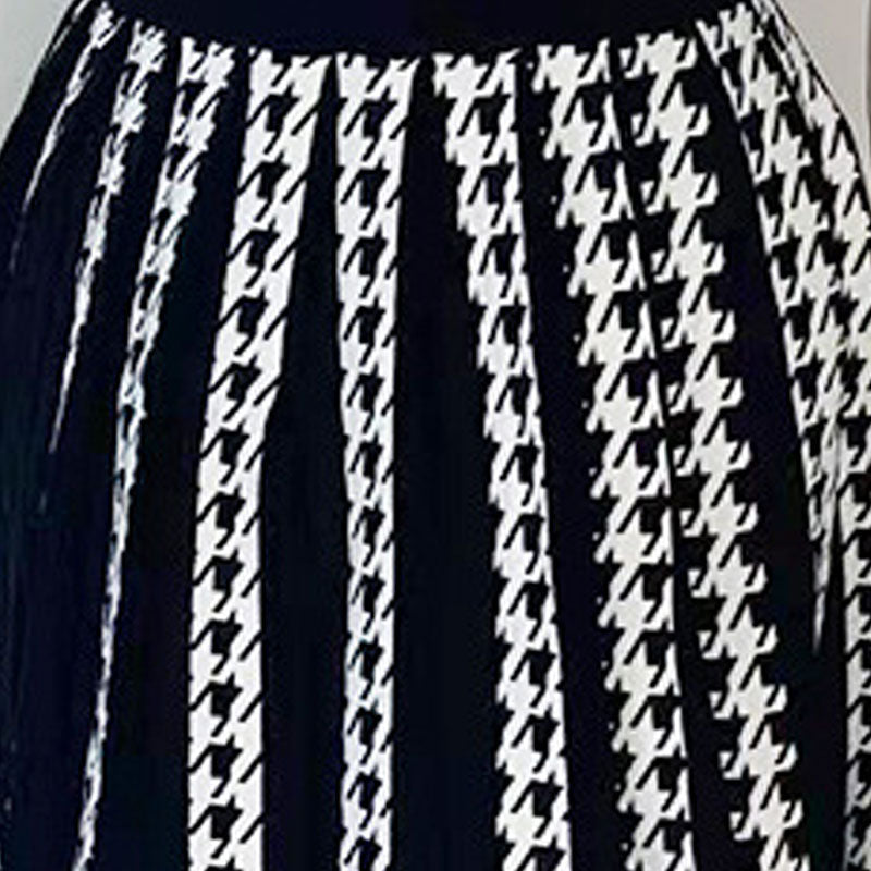 Contrast Buttoned Houndstooth Print Sleeveless Fit and Flare Mini Pleated Sweater Dress