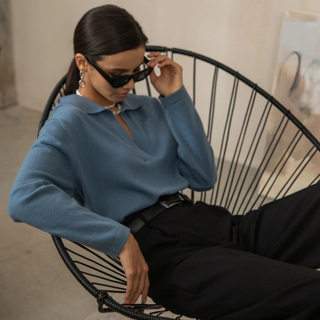 Fabulous Solid Color Collared V Neck Long Sleeve Sweater - Blue