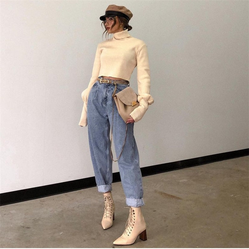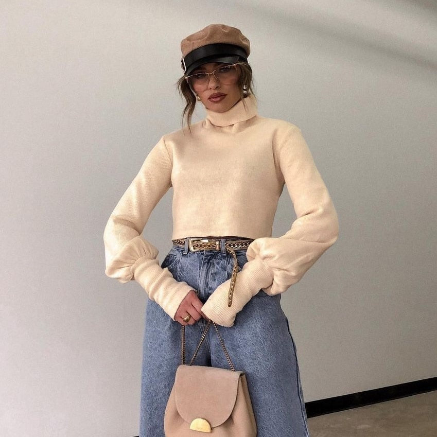 Solid Knitted Sweater with Turtleneck Collar, Long Sleeve, and Cotton Material