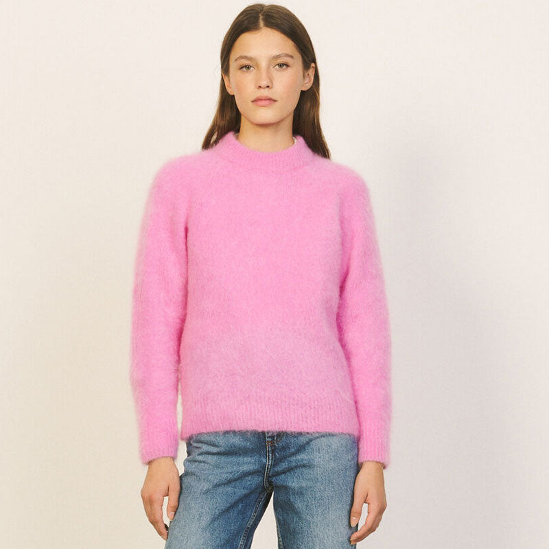 Sweet Round Neck Long Sleeve Mohair Knit Pullover Sweater - Hot Pink