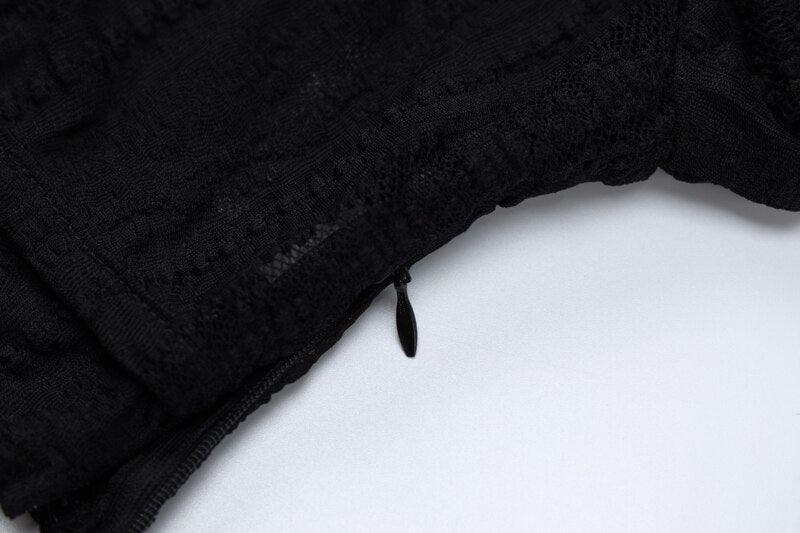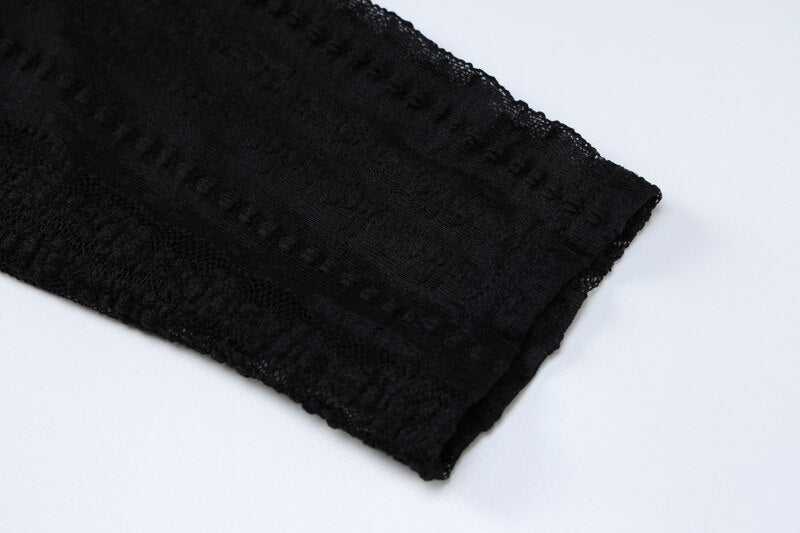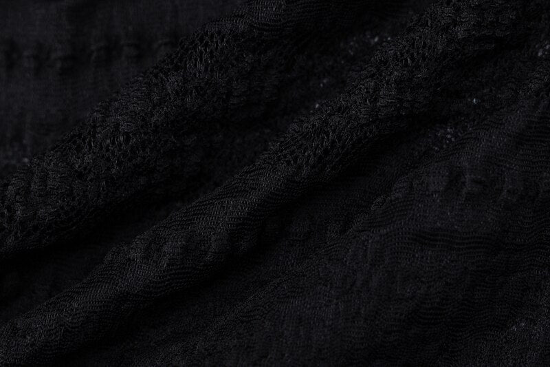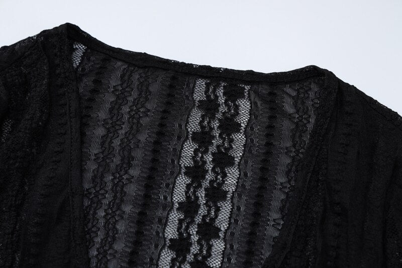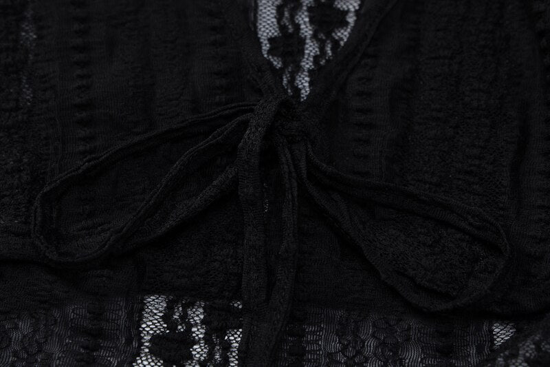Featuring a delicate and intricate lace pattern that adds a touch of femininity and elegance to any outfit, this top is perfect for you. The see-through design is perfect for showing off your favorite bralettes or layering with other tops. The v-shaped front hemline adds a unique and flattering shape to the overall design, making it a standout piece in your wardrobe.