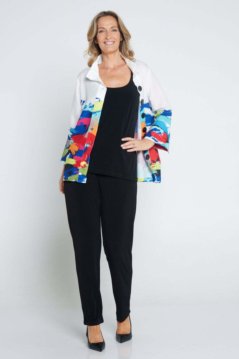 Introducing the Annette Shirt in a vibrant artistic print, a must-have for those who love to make a statement with their wardrobe. This blouse features an explosion of bold colours on a white base for an instant eye-catching look.