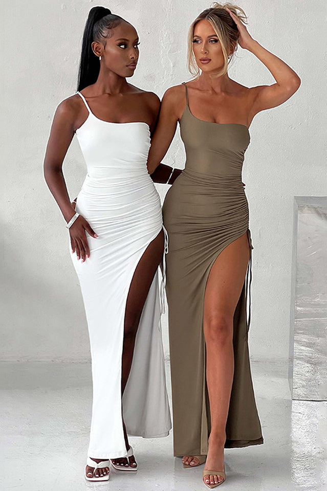 This simple and striking asymmetrical gown is crafted from a soft jersey and features side gathers and a sexy thigh high split.