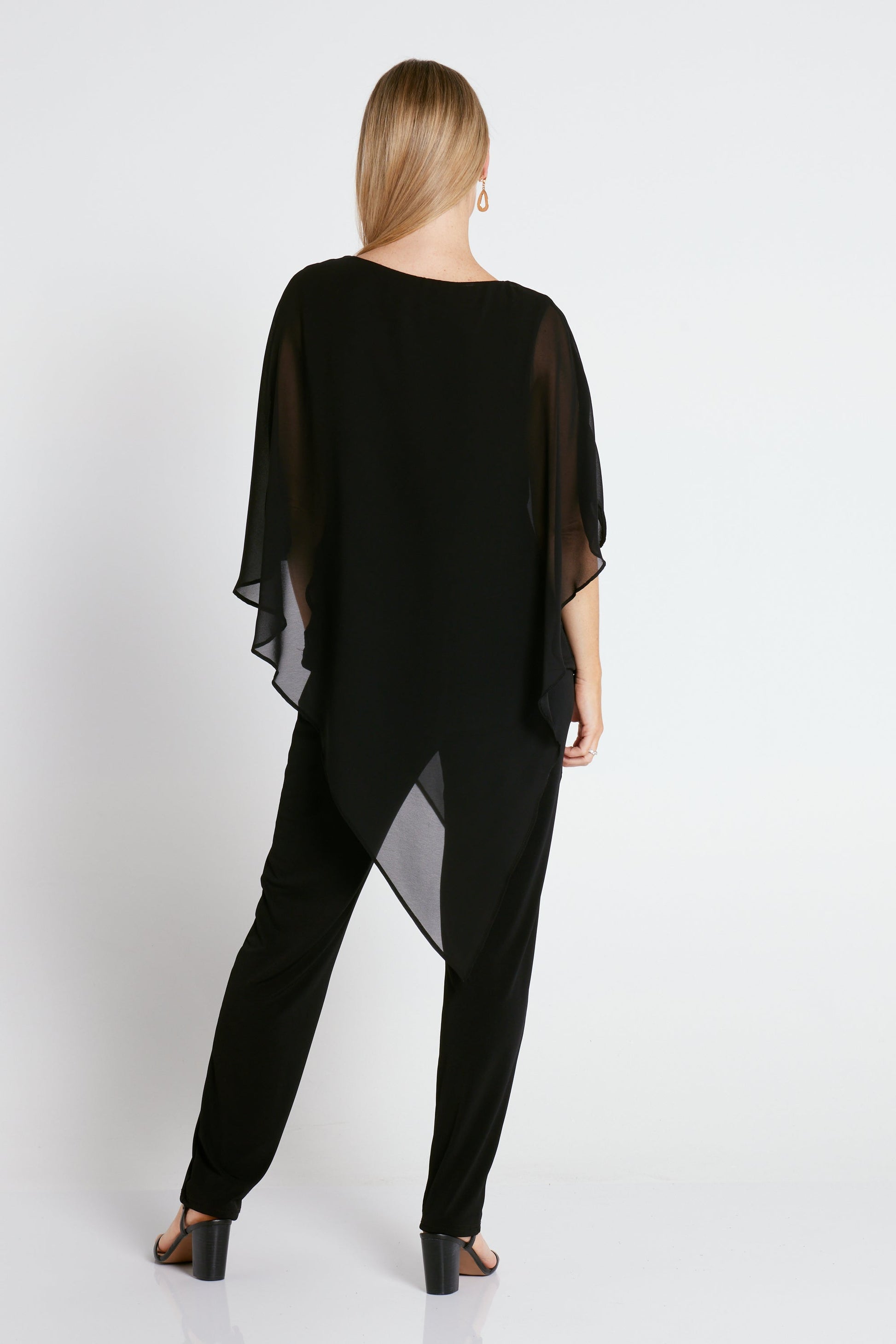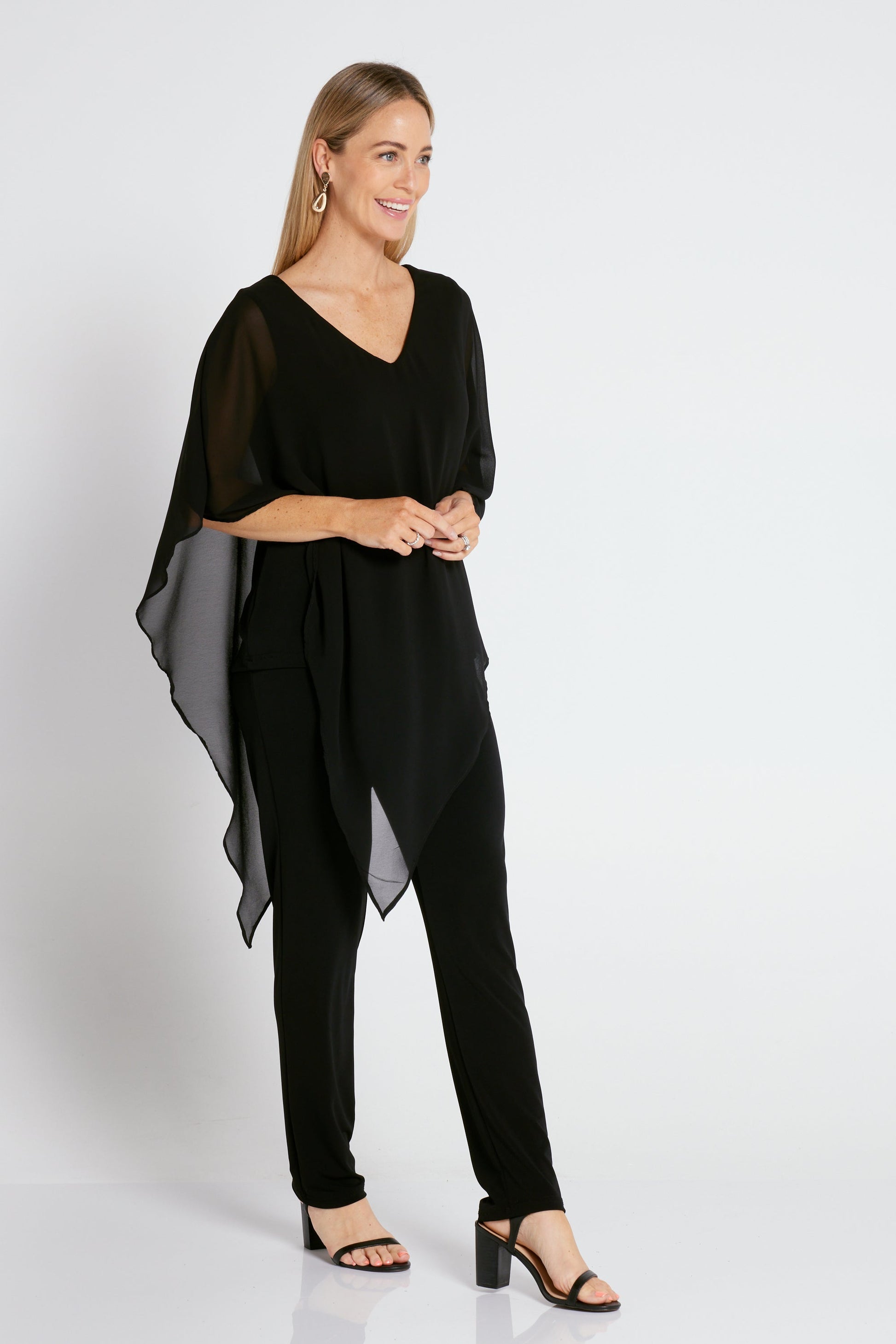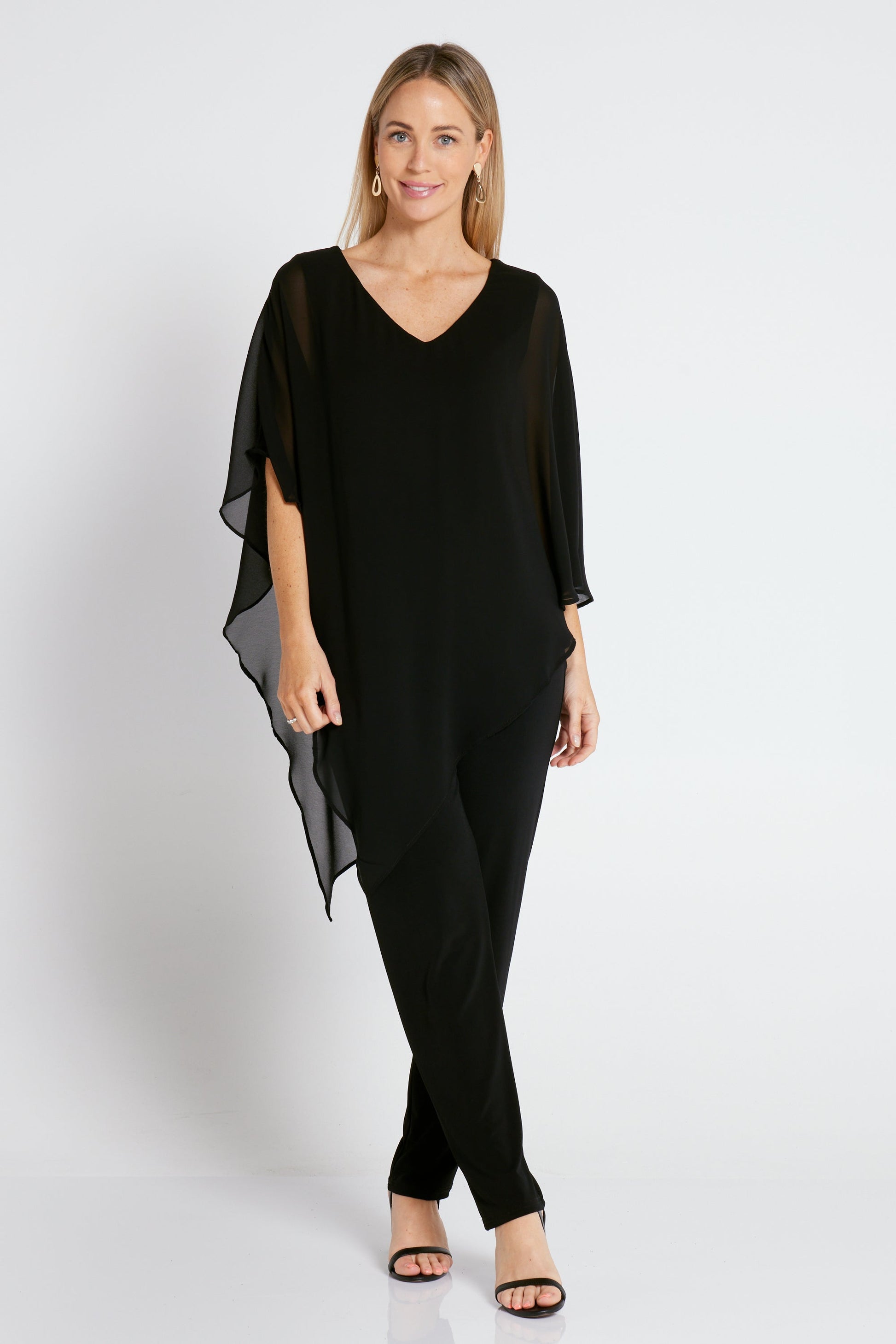 Exceptionally elegant, the Australian made Aubriella Top is perfect for the evening. Simple in its construction, it consists of a jersey underlay, with a floating chiffon overlay that drapes to a point to one side. This also allows you to tie the points together, to create a different look. Now in classic, stylish black, for a timeless, sophisticated look. Such a stunning style for special occasions.