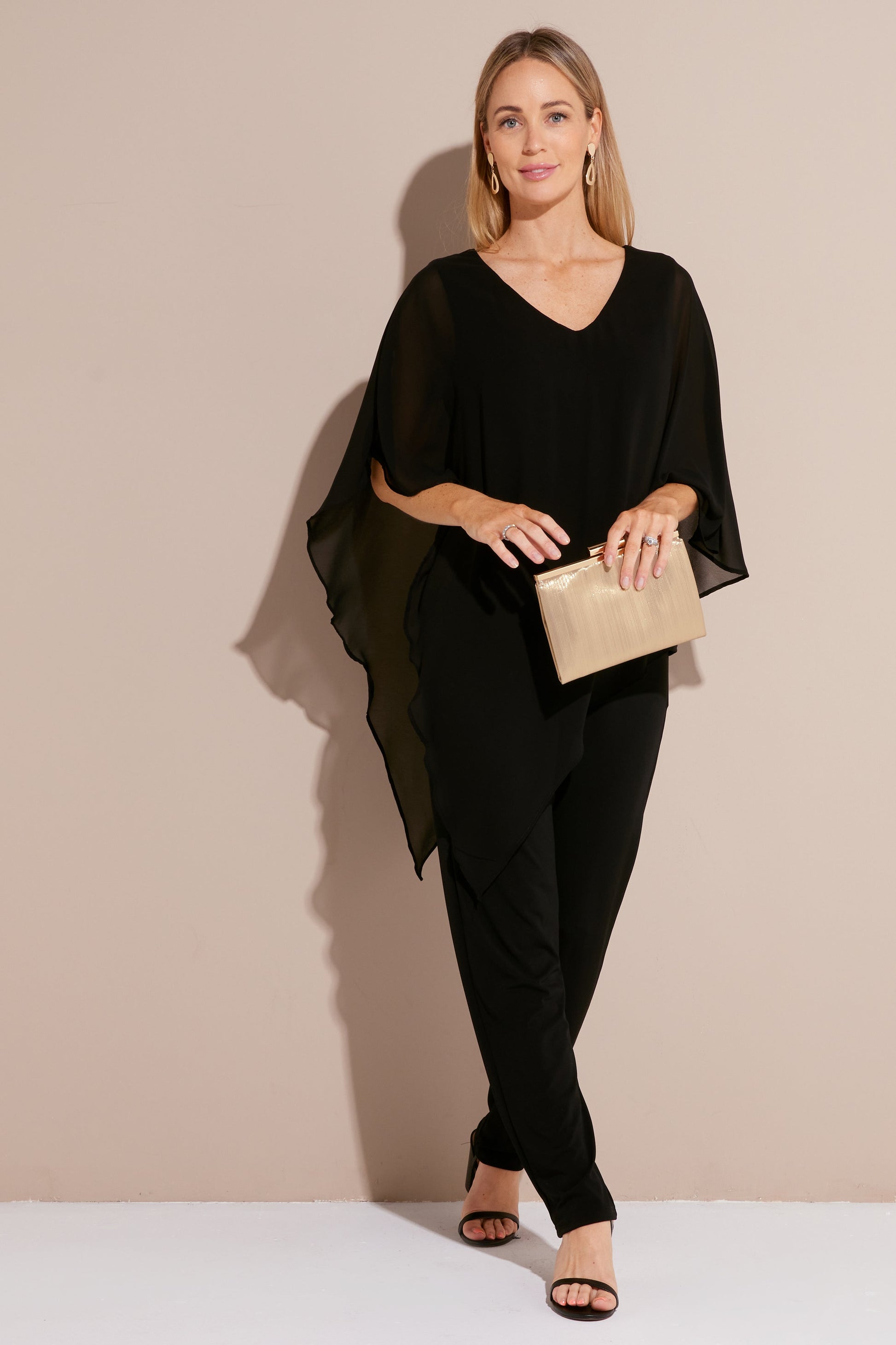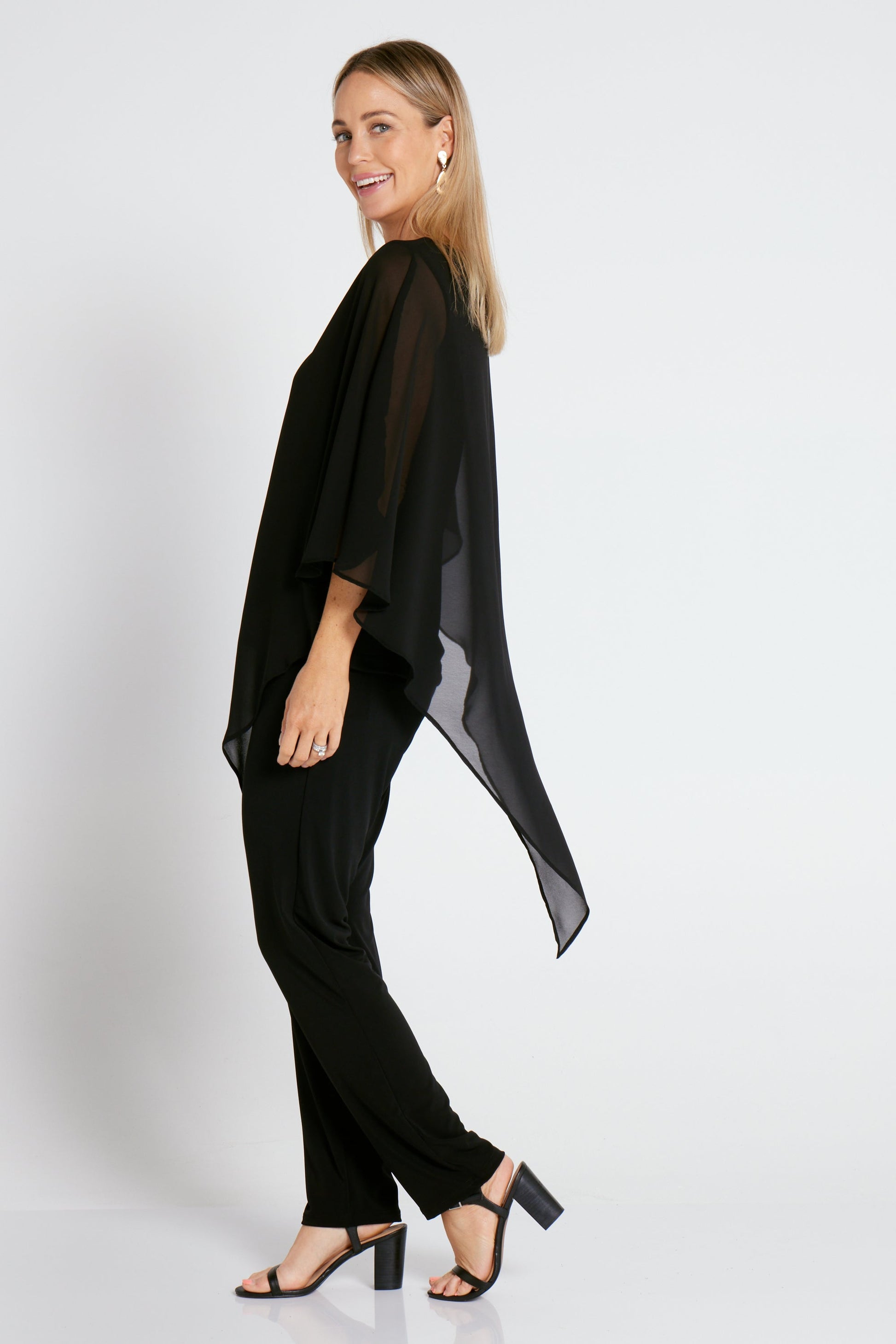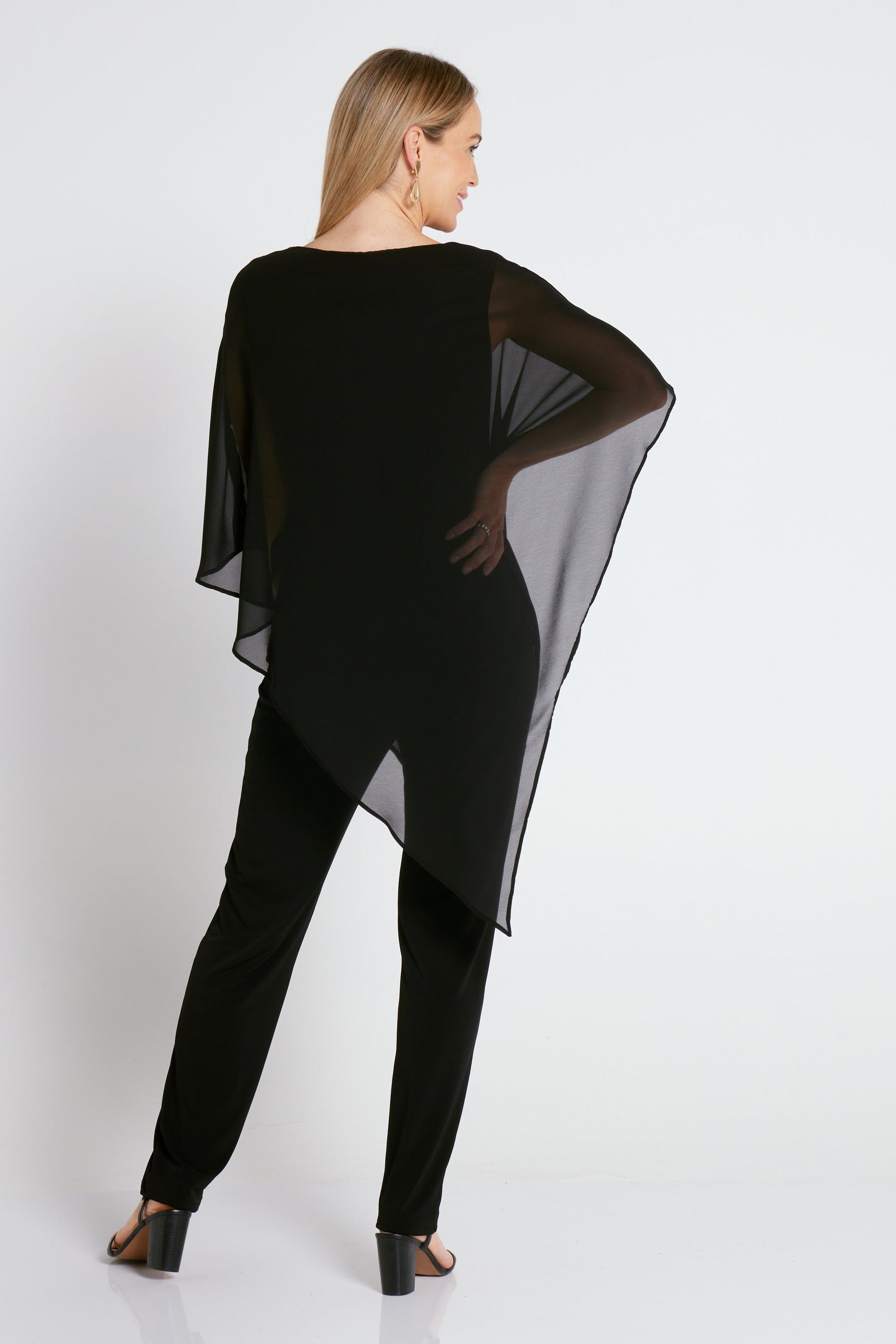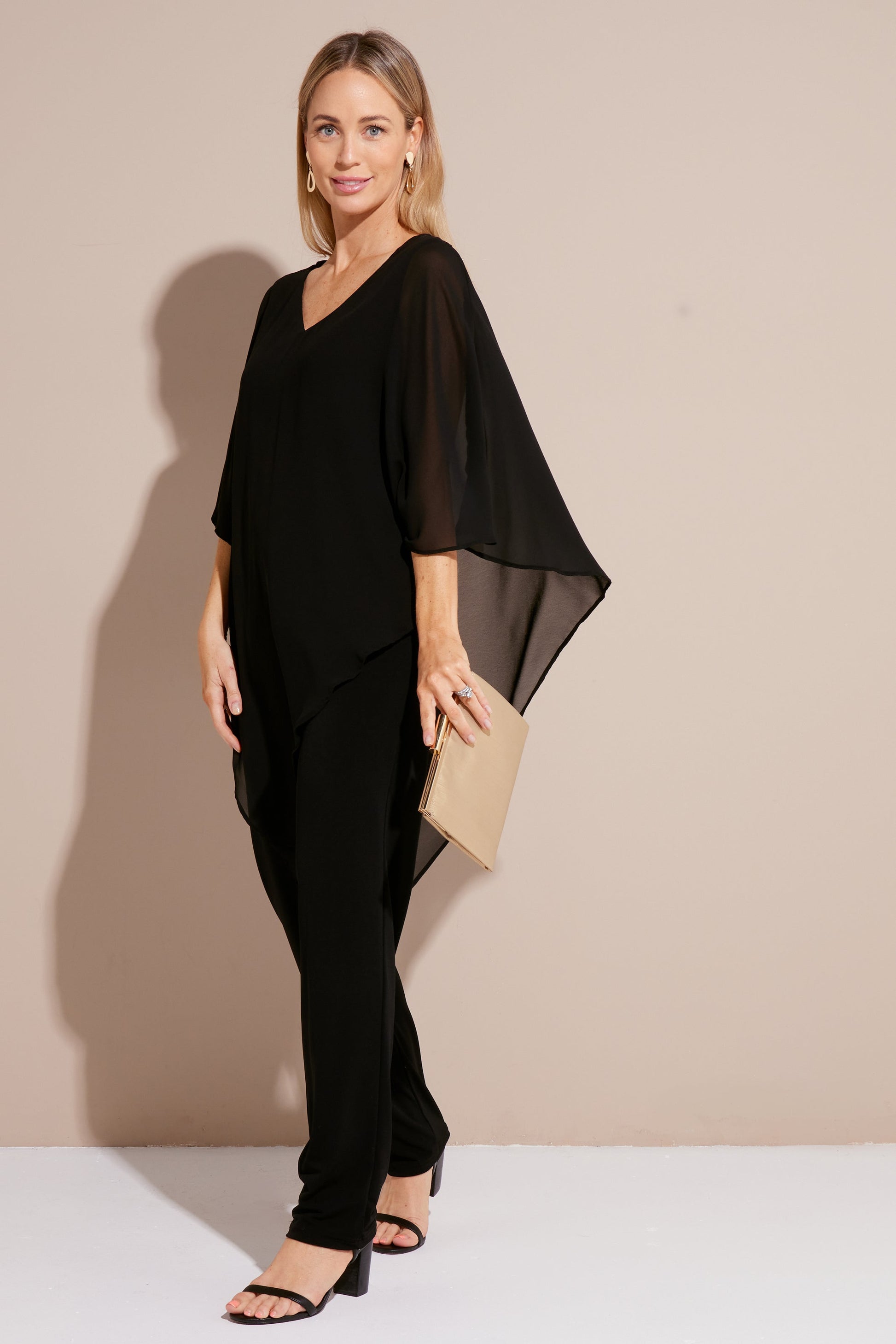 Exceptionally elegant, the Australian made Aubriella Top is perfect for the evening. Simple in its construction, it consists of a jersey underlay, with a floating chiffon overlay that drapes to a point to one side. This also allows you to tie the points together, to create a different look. Now in classic, stylish black, for a timeless, sophisticated look. Such a stunning style for special occasions.