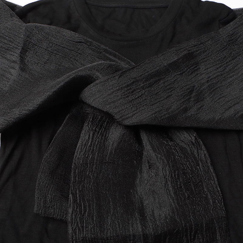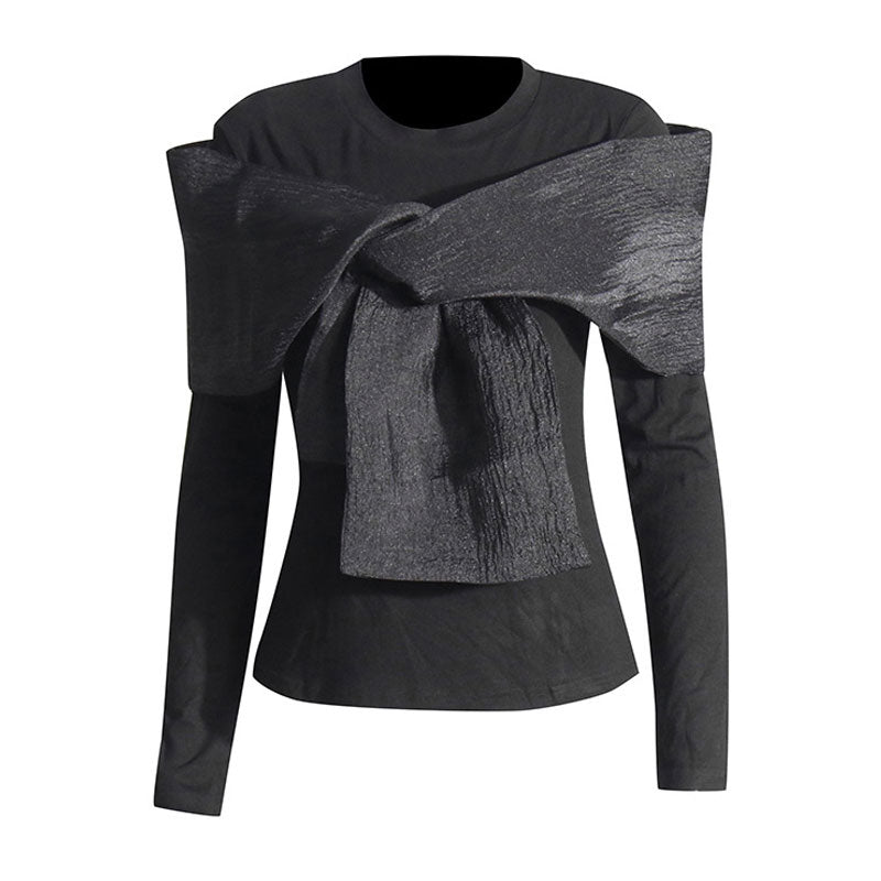 This stylish fitted top is a winter wardrobe essential! Flaunting a classic black hue. it covers all the basics. Imagine this: a snug round neck and long sleeves to keep you cozy on those chilly days. But here's the twist—literally! A textural crinkled bowknot panel at the chest adds an extra dash of style with its twist design. This luxury designer slim top is perfect for effortlessly staying chic and comfy during the winter chill!