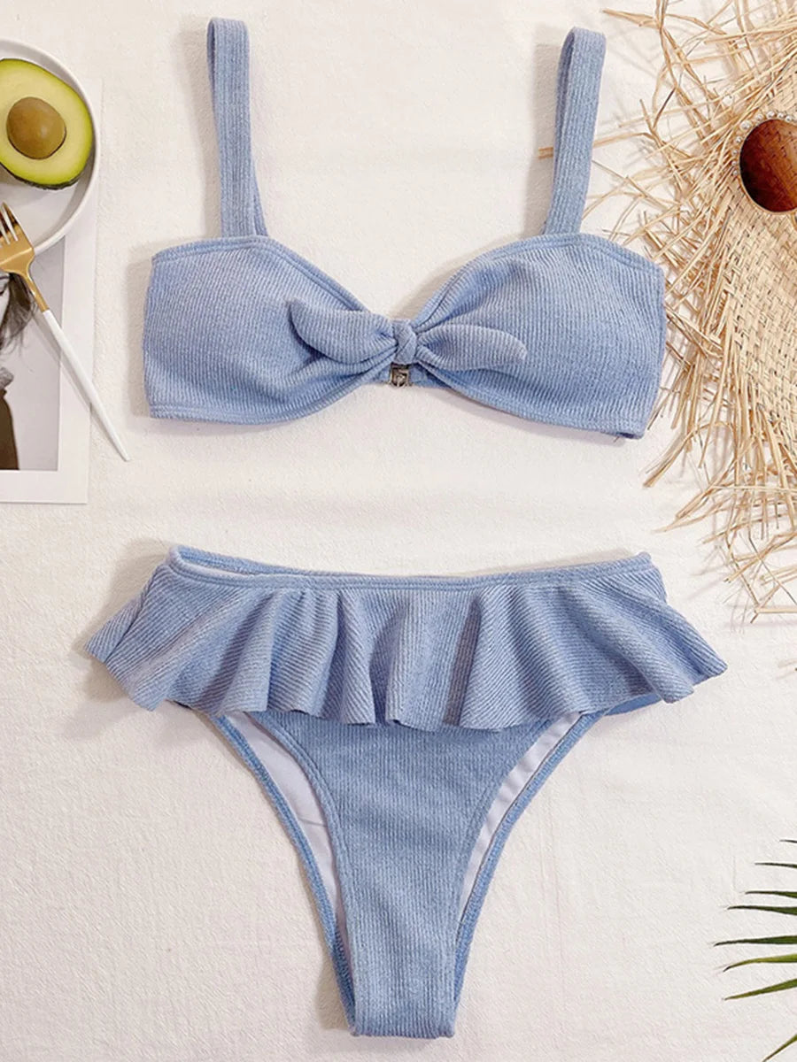 Get back in the rhythm with our Two Piece swimsuit, made from a comfortable blend of polyester and spandex. The solid color and wire free support create a flattering silhouette, while the low waist allows for a comfortable fit. Perfect for any beach or pool outing!