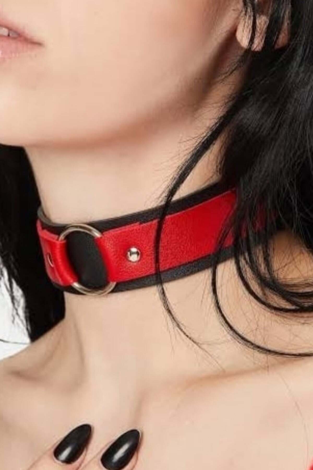Black and Red Ring Detailed Adjustable Stylish Leather Collar