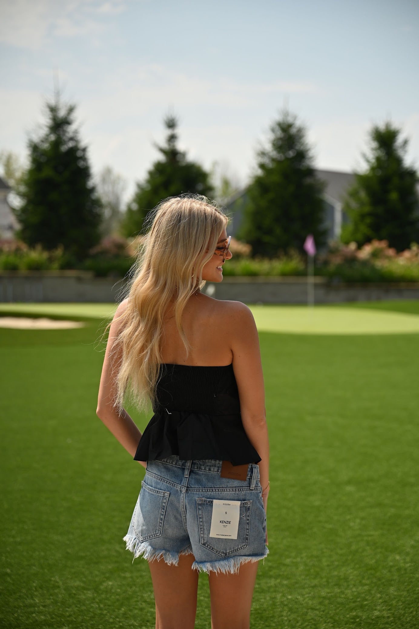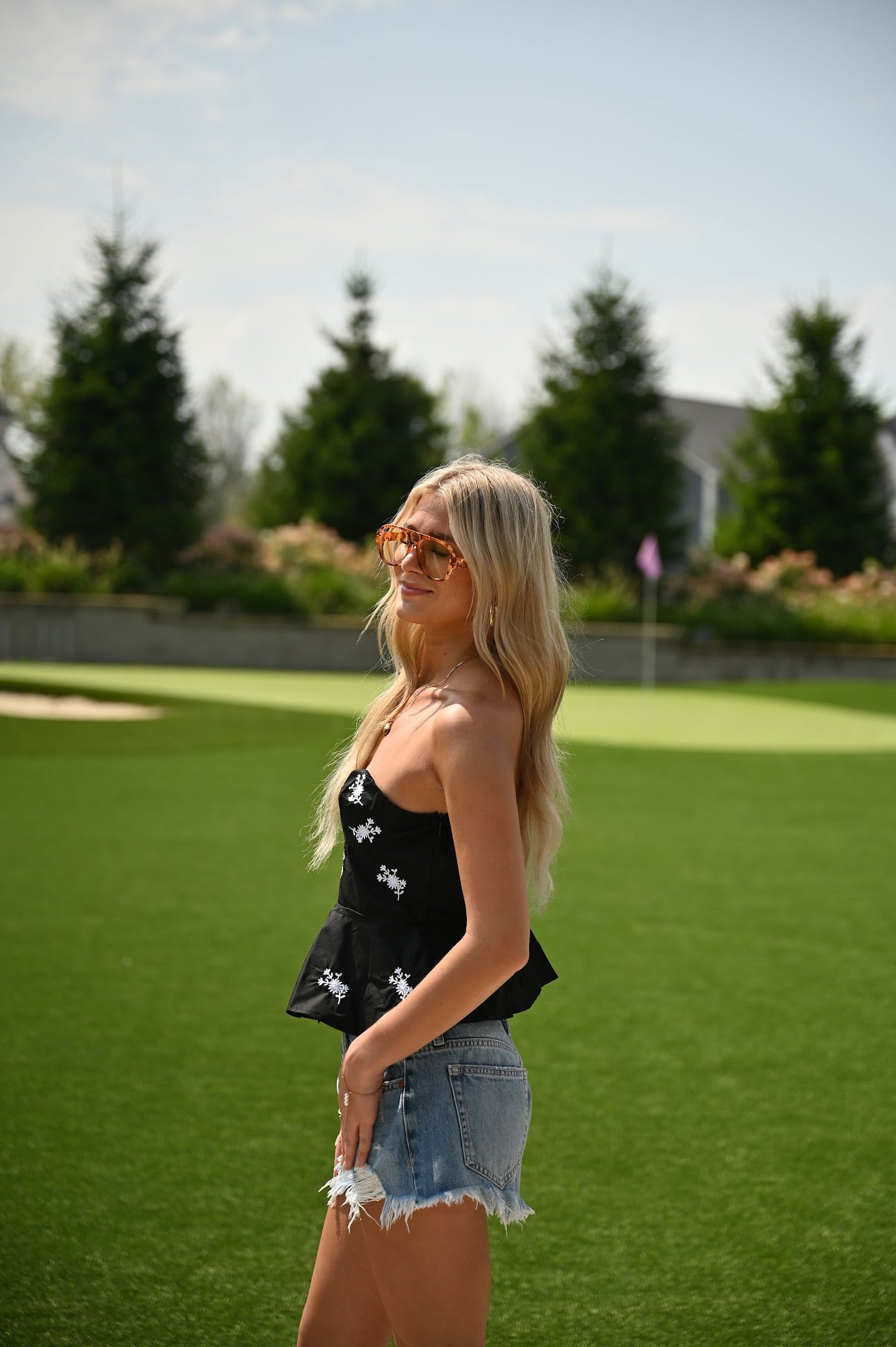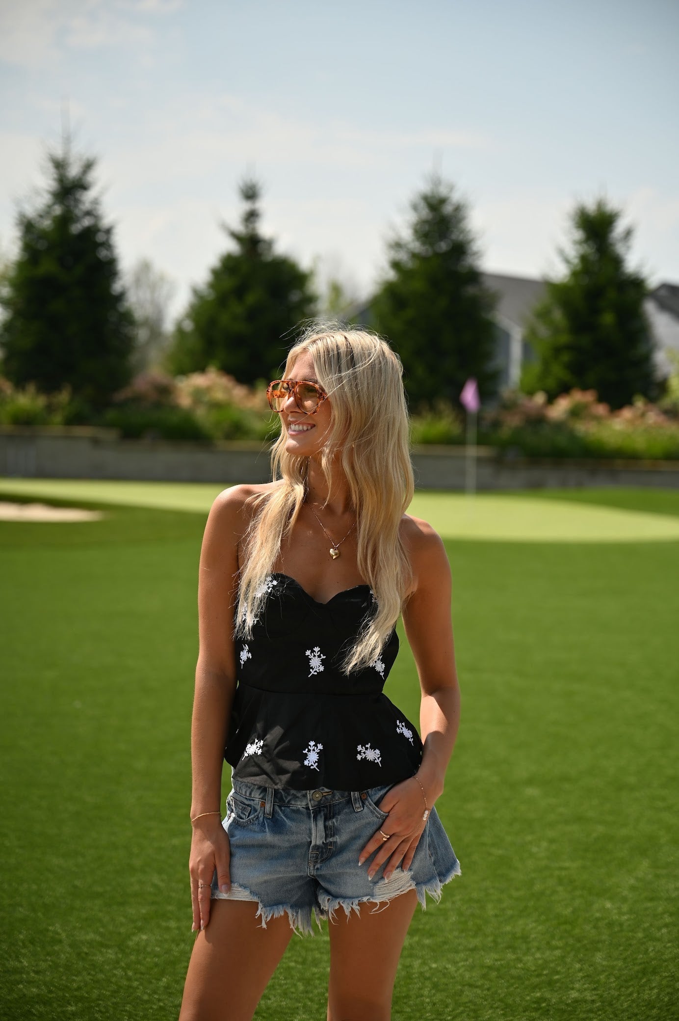 Step out in our Black Tube Top, a versatile piece elevated by white floral embroidery. Featuring a sweetheart neckline and peplum hem, this top combines classic elegance with a modern twist. Perfect for an evening out or a casual day, it's designed to make a statement while providing a flattering fit.