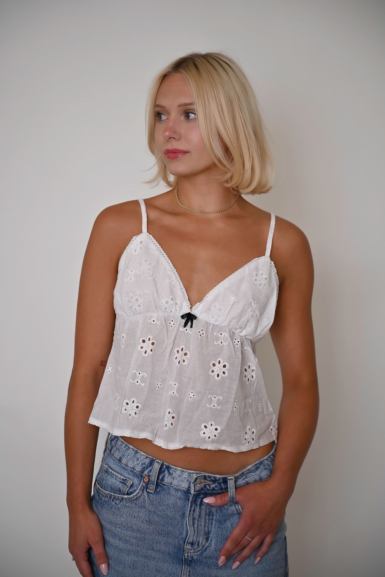 Introducing the Breeze Catcher Top, your summer essential. Crafted from breezy eyelet fabric, it's perfect for the sunniest days. Delicate spaghetti straps and a plunging neckline adorned with a sweet black bow add a whimsical touch. With its flattering empire waist and flared hem, it offers a relaxed yet refined silhouette. Ideal for park picnics or casual outings, this versatile white top pairs effortlessly with denim or flowing skirts. Embrace summer with elegance and ease.