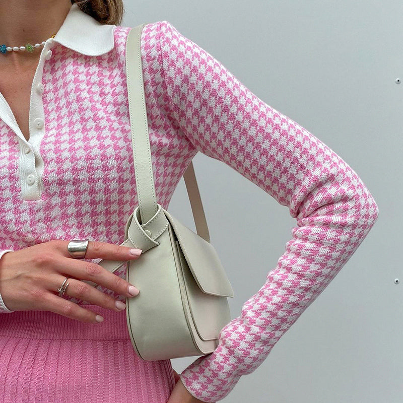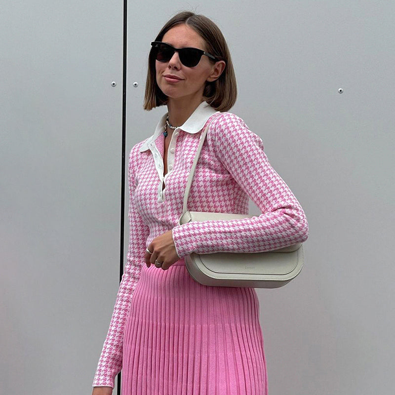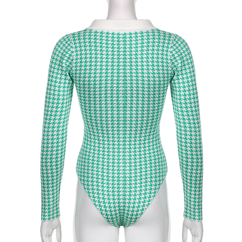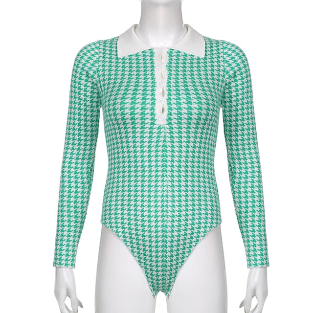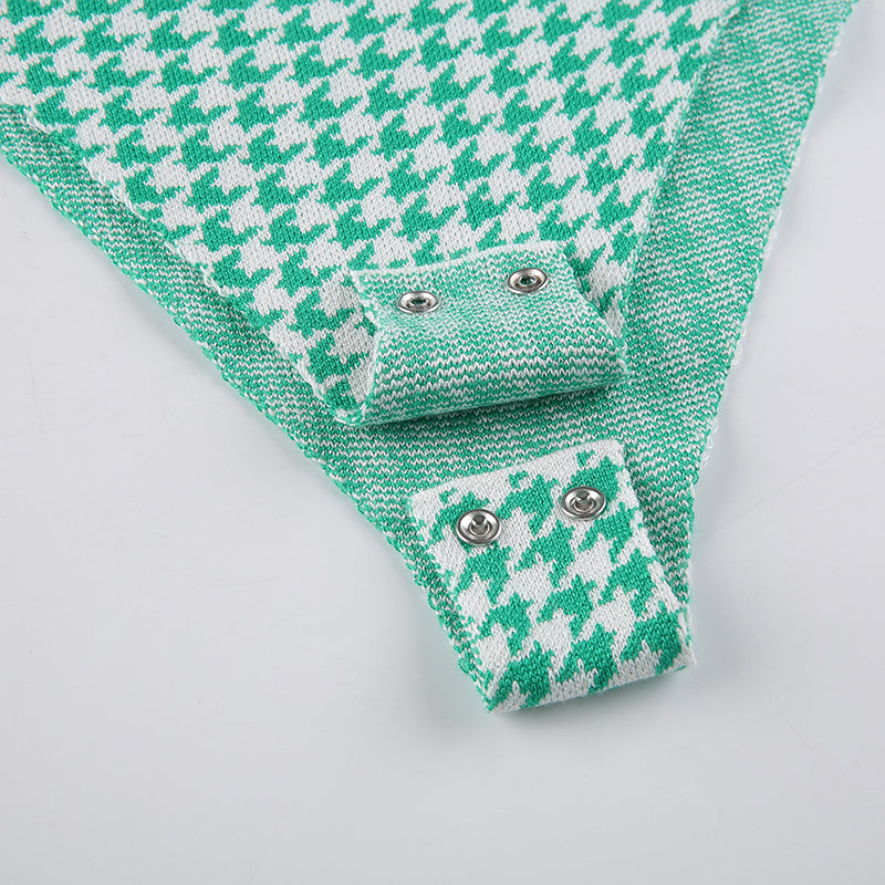 This long-sleeved knitted bodysuit is a super-chic and stylish piece to team with your favorite outfits. The stylish houndstooth pattern is a stylish and fashionable addition to any wardrobe. This versatile piece has a great fit and stretchy material that allows for easy movement and a comfortable fit for all-day wear.