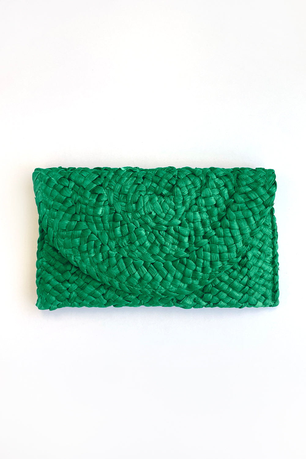 Elevate your event look with this elegant Cabana Raffia Clutch. Crafted from green tone paper raffia for an effortless resort wear finish. This clutch is designed with a curved flap, faux leather binding, fully lined interior, and magnetic button closure. Add the finishing touch to your outfit with this beach-chic clutch, perfect for summer days.