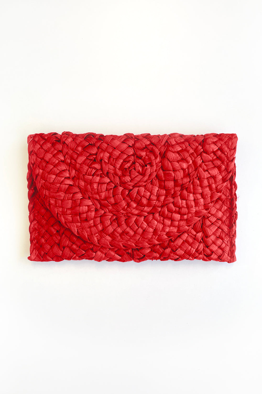 Elevate your event look with this elegant Cabana Raffia Clutch. Crafted from a summery melon coloured paper raffia for an effortless resort wear finish. This clutch is designed with a curved flap, faux leather binding, fully lined interior, and magnetic button closure. Add the finishing touch to your outfit with this beach-chic clutch, perfect for summer days.