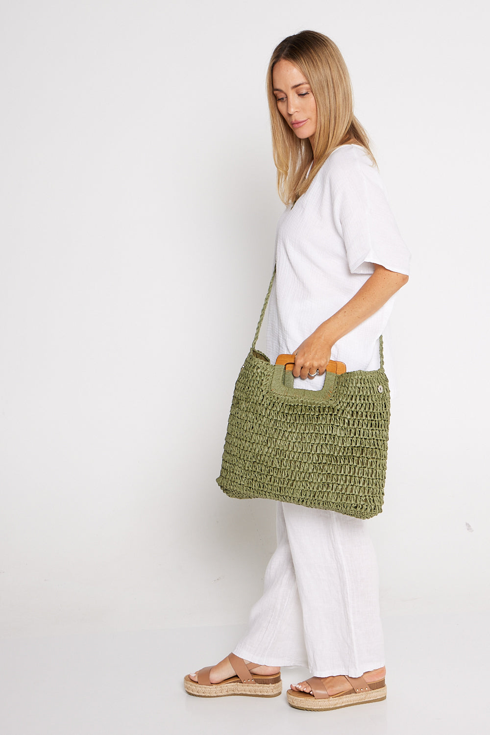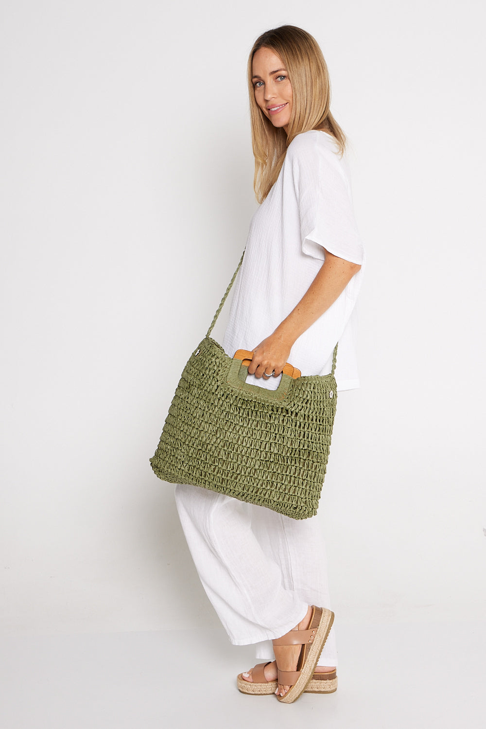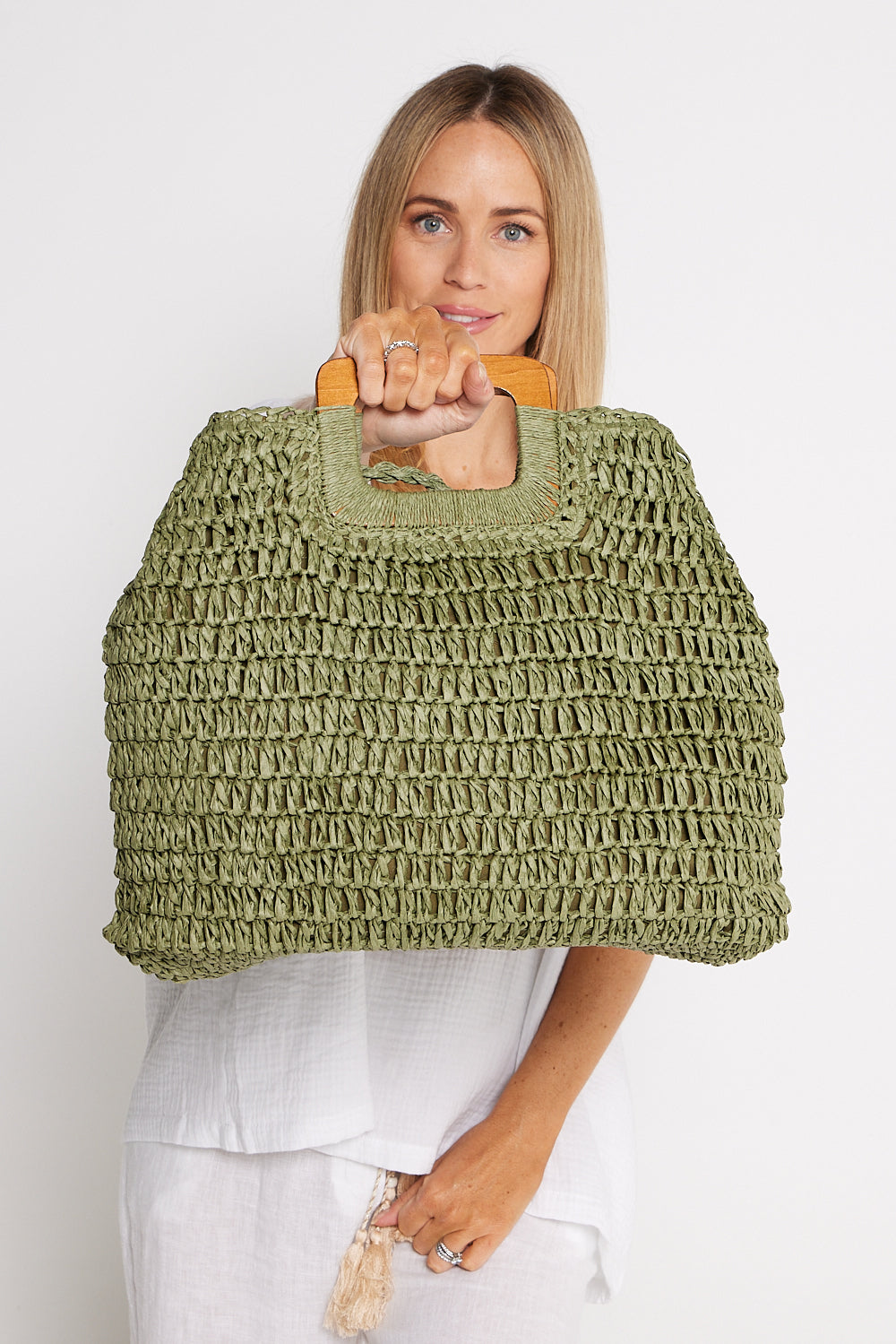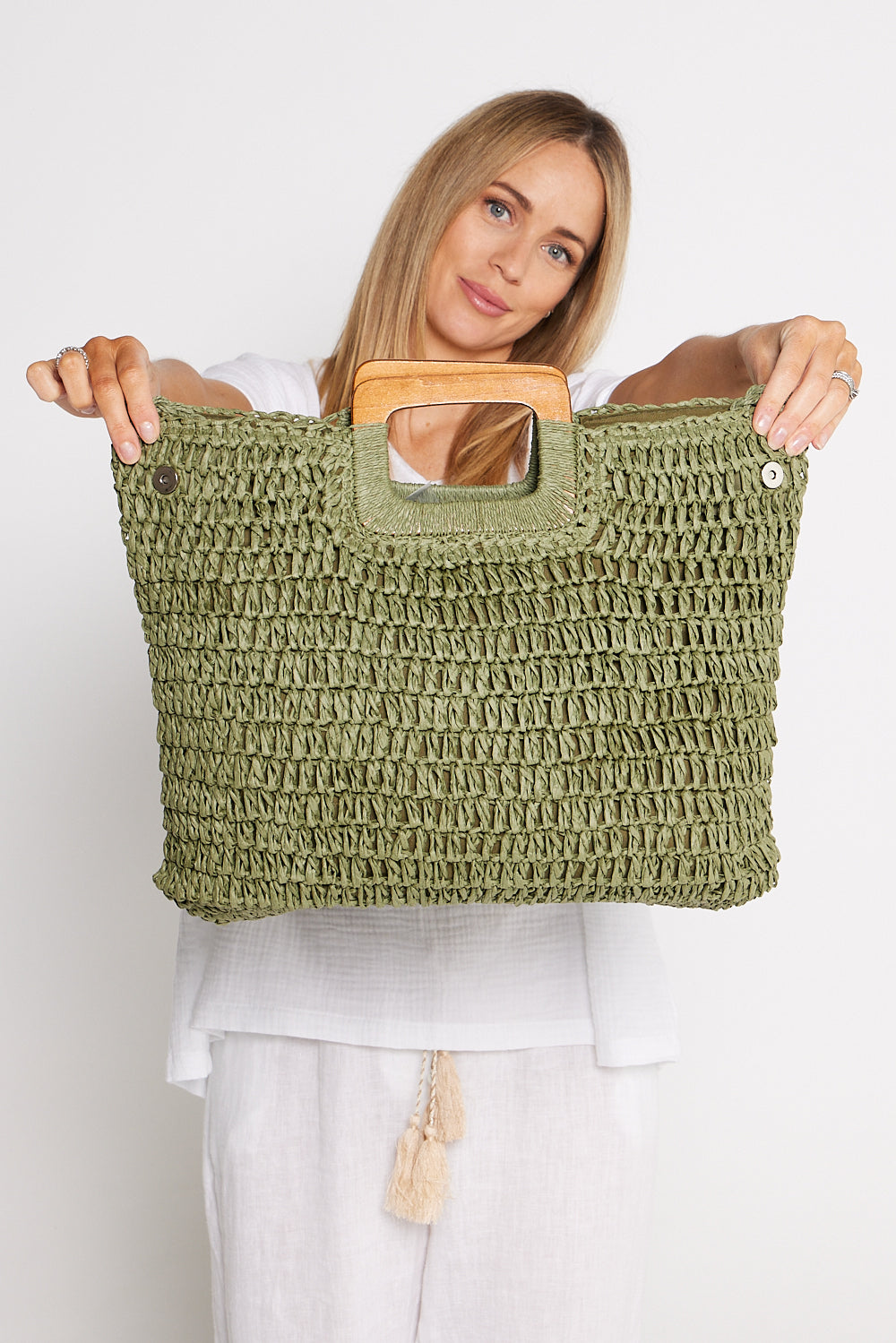 Elevate your beachside style with the Cancun Raffia Handbag. Its kahki, natural tone captures the essence of tropical charm. The woven raffia-style outer brings texture, while wooden handles and a braided shoulder strap offer a chic touch. Fully lined with a zip closure and small inner pocket, it's both practical and fashionable.