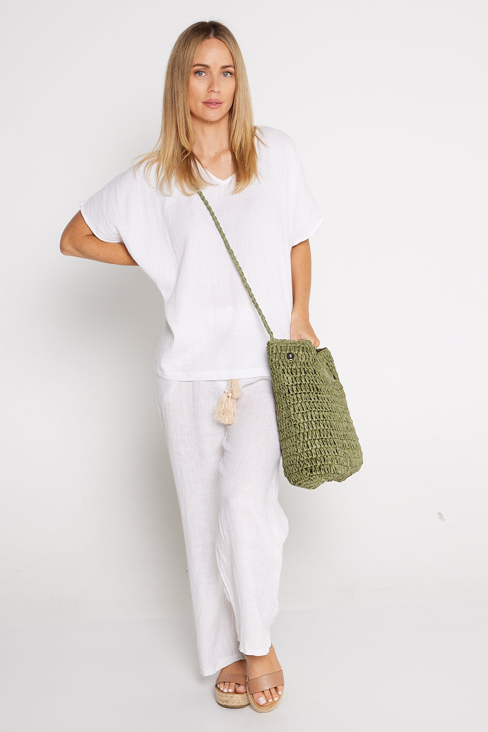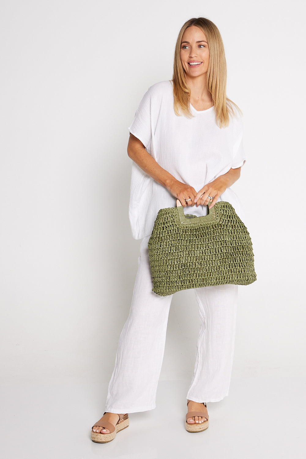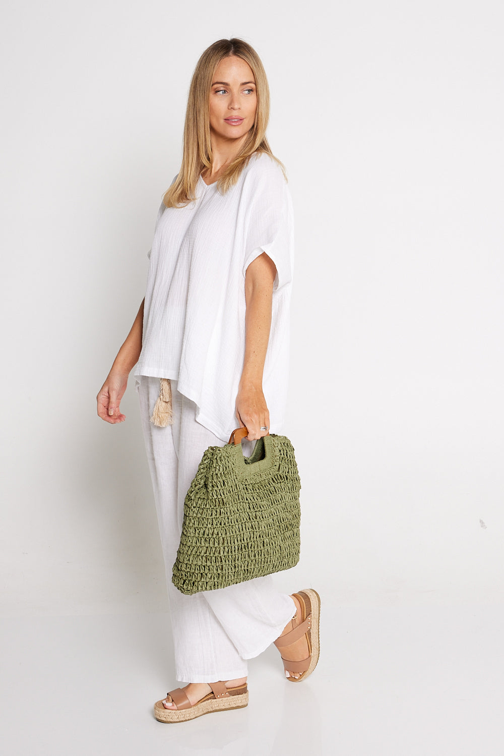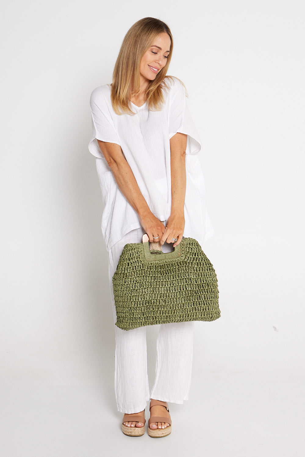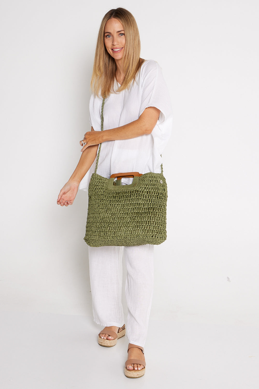 Elevate your beachside style with the Cancun Raffia Handbag. Its kahki, natural tone captures the essence of tropical charm. The woven raffia-style outer brings texture, while wooden handles and a braided shoulder strap offer a chic touch. Fully lined with a zip closure and small inner pocket, it's both practical and fashionable.
