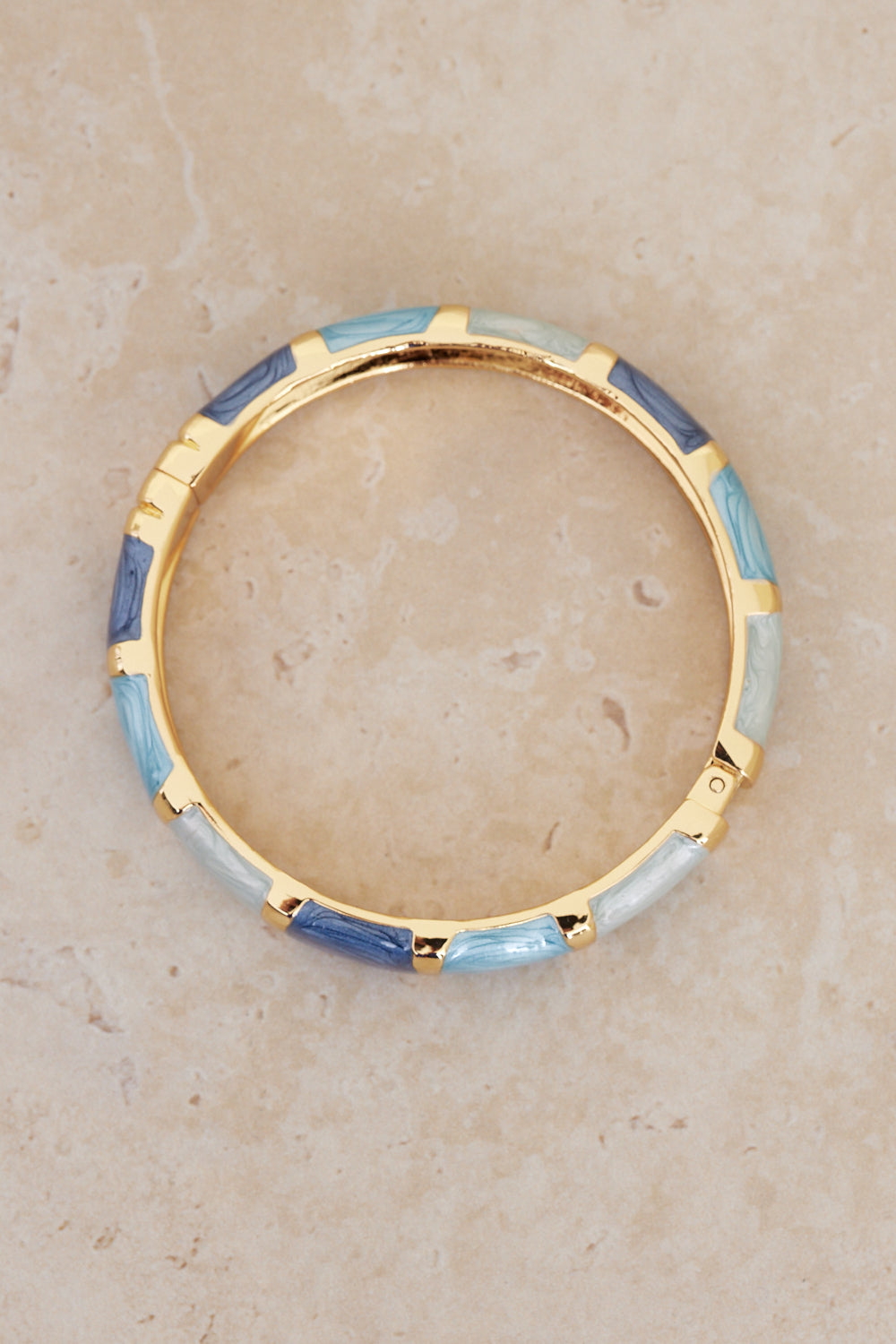 Add a pop of colour with the Capri enamel bangle in gold. Featuring soft hues of blue and white in a marbled enamel design, this chic bangle is perfect for bringing a coastal-inspired elegance to your outfit. Its hinged closure ensures easy wear, making it a standout piece for any jewellery collection.