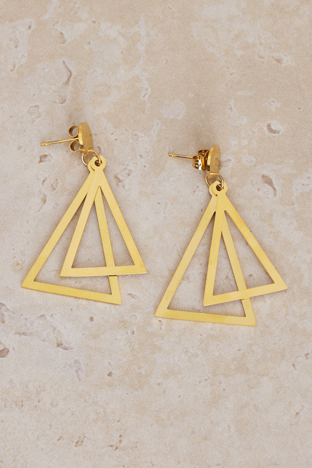 Introducing our elegant gold-coloured Carla earrings, designed to make a statement with their modern geometric shape. These earrings feature a striking triangular design, combining sleek lines and an open-frame structure for a contemporary look.