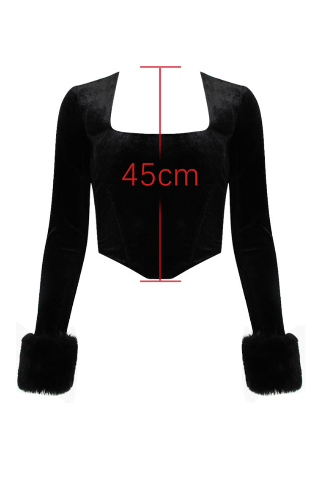 "Catriona" is made from ultra-luxe stretch velvet that feels rich and soft. The faux fur cuffs add to the festive atmosphere, and the supportive bone buttons perfectly tighten the waist. "Catriona" can be worn with tailored trousers or jeans for a casual look.