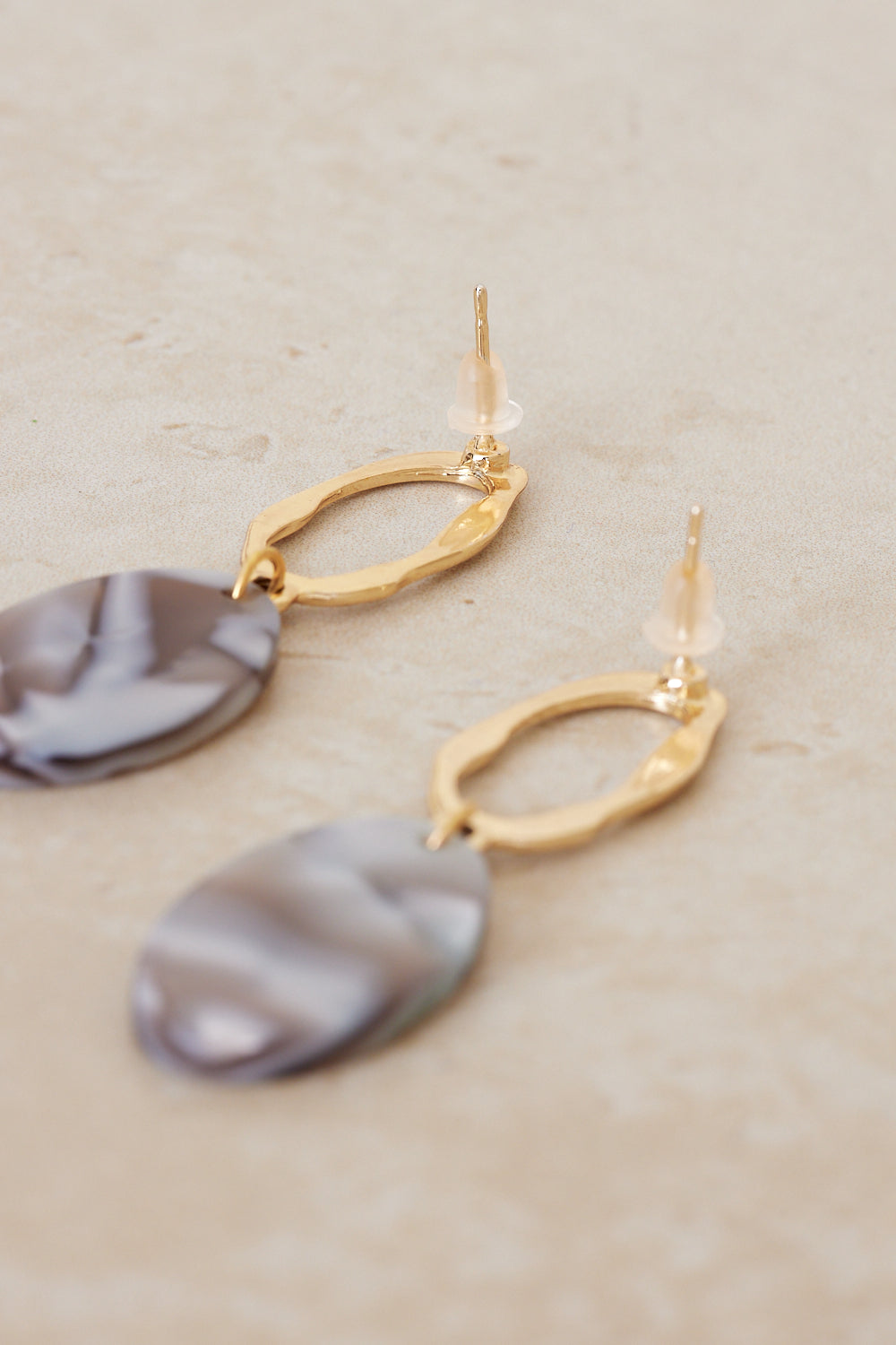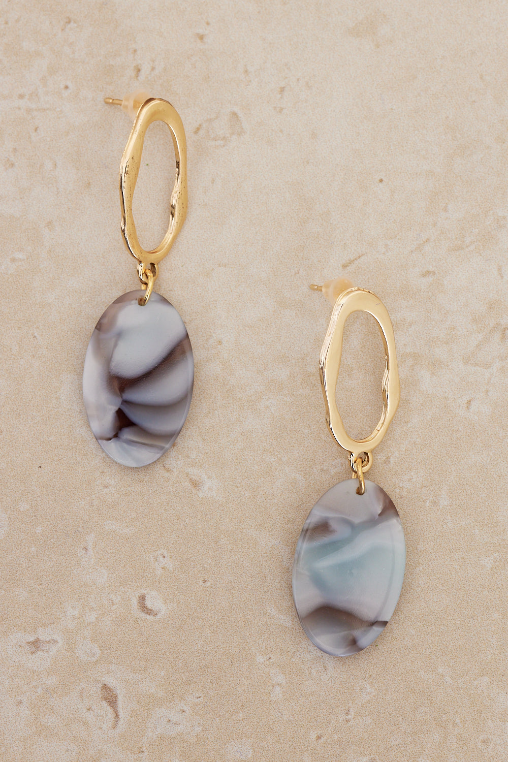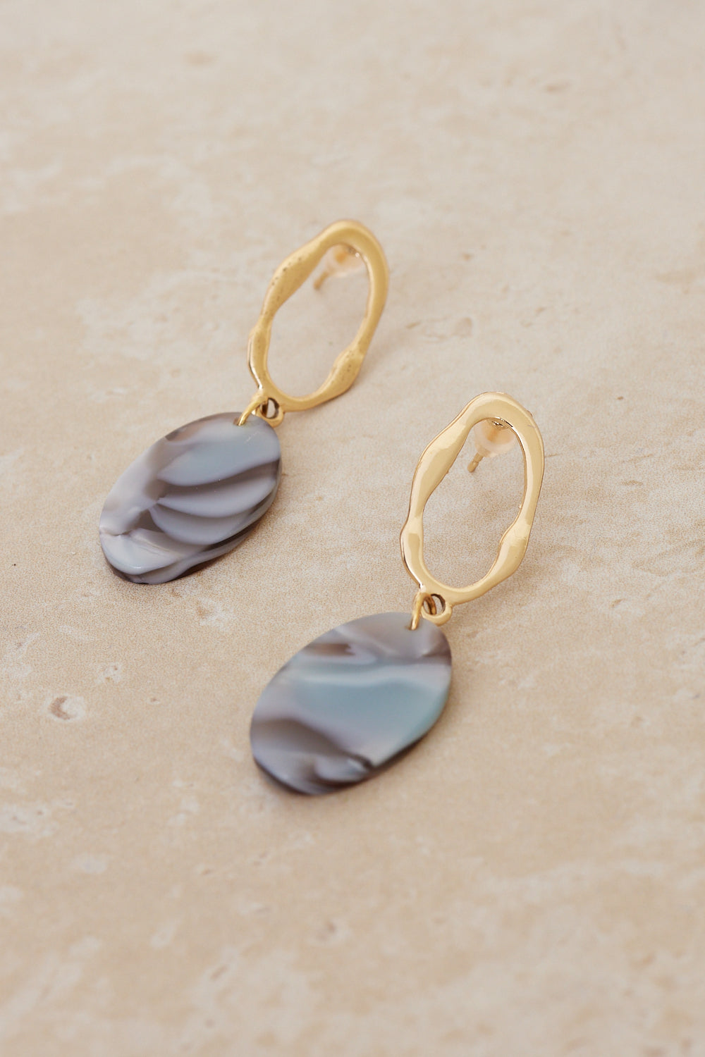 Introducing the Celeste Drop Earrings, now in an opal look option. These are such a stylish and chic addition to your jewellery collection. These earrings feature a gold-coloured hammered finish hoop that connects to a beautiful opal look resin oval drop, combining classic elegance with modern flair.