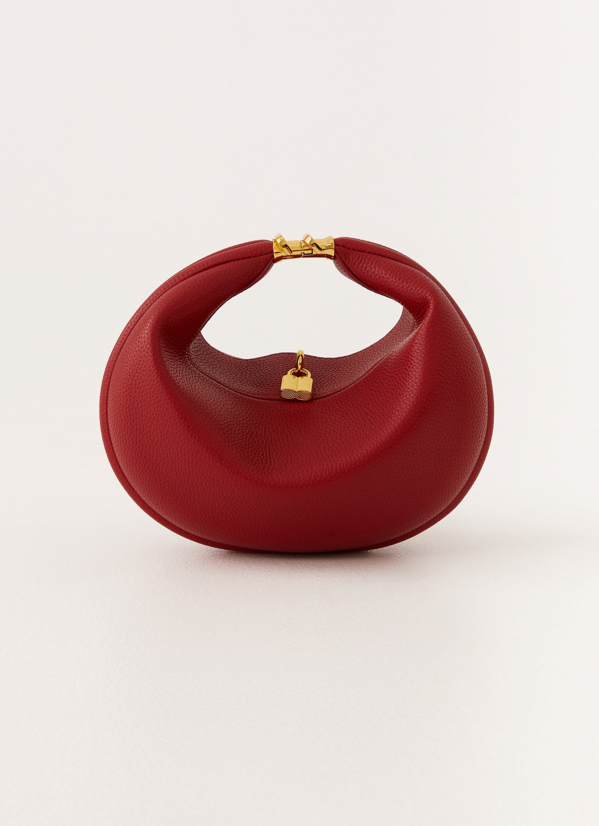 The Celestial Bag features a unique oval shape, complemented by a secure zip closure for easy access. In a bold red hue, it adds a pop of color and sophistication to any outfit. Perfect for those who love a statement accessory.