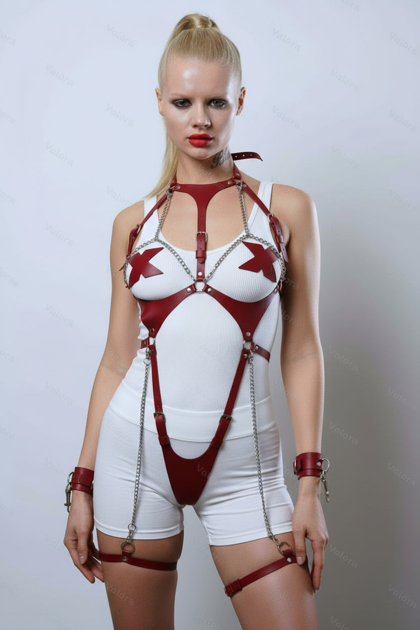 Unleash your inner temptress with the Enslaved Desire Chain Harness Set. This daring ensemble combines supple leather straps with cold steel chains, tracing every curve of your body in provocative detail. The integrated cuffs and thigh straps add a thrilling element of restraint, while the open cup and minimal thong design leave just enough to the imagination. Crafted from premium materials to ensure both comfort and durability during your most intimate moments.