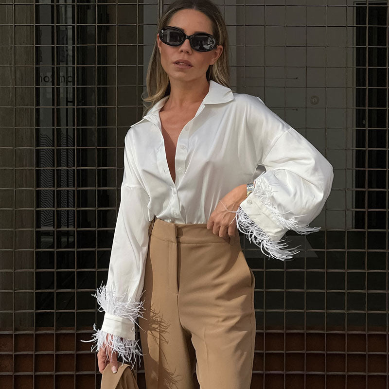 Classy Faux Feather Trim Long Sleeve Collared Button Down Satin Blouse - White
