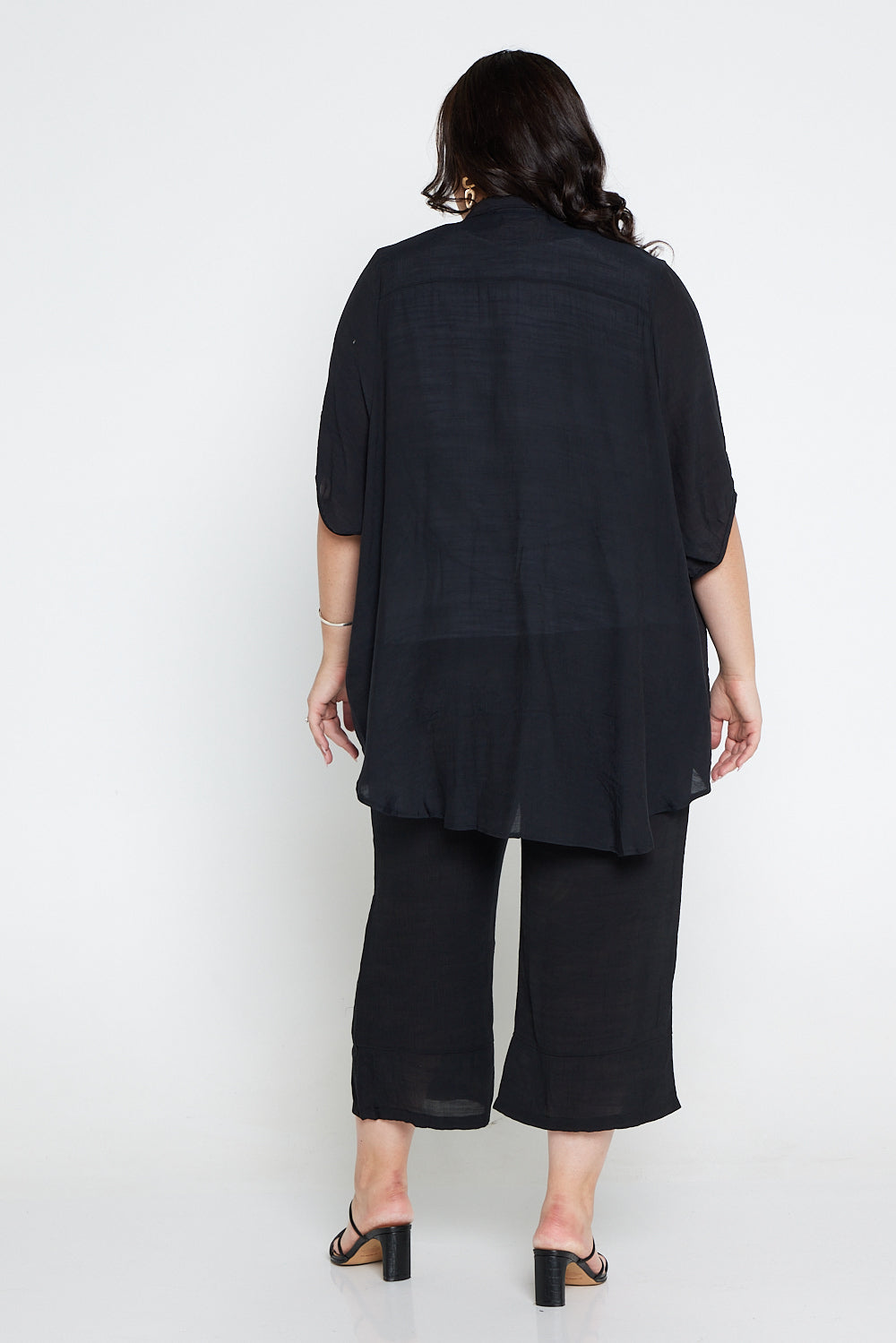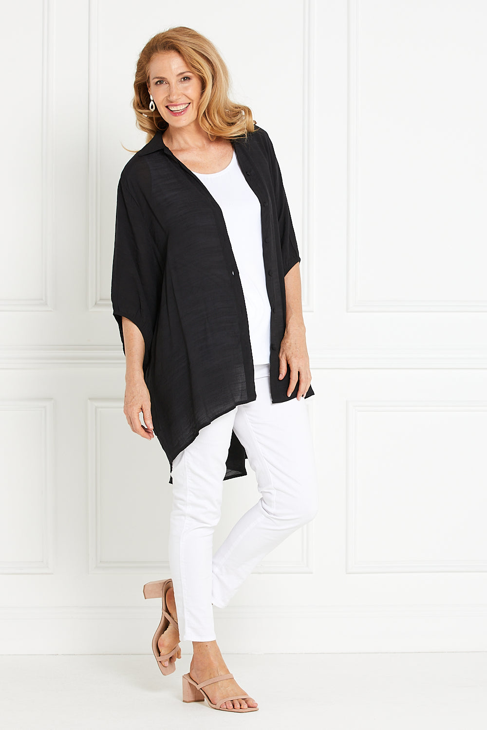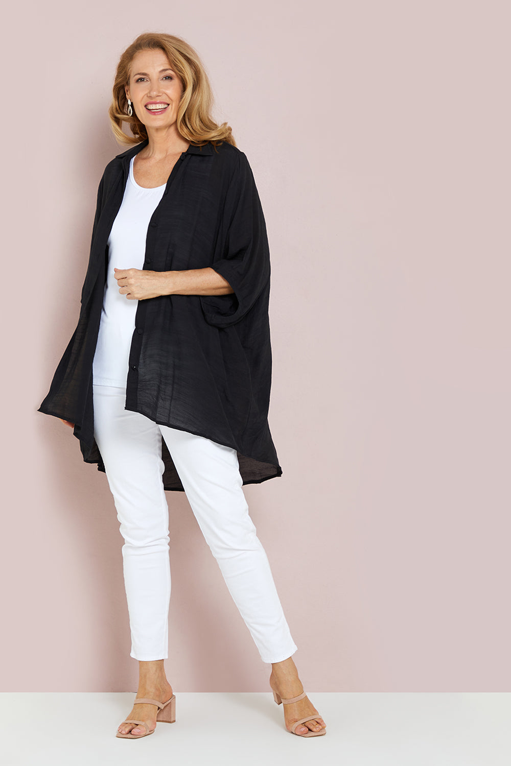 In timeless, sleek black, the comfort shirt is such a handy basic. Whether you button it to show off its longline, tunic silhouette, or leave it open to create the perfect lightweight warm-weather jacket, you will be comfortable and stylish. Cut from a cotton-rich, textured fabric, this shirt drapes effortlessly over the body. A beautiful canvas for accessories, there's nowhere this cool, breezy design won't come in handy.
