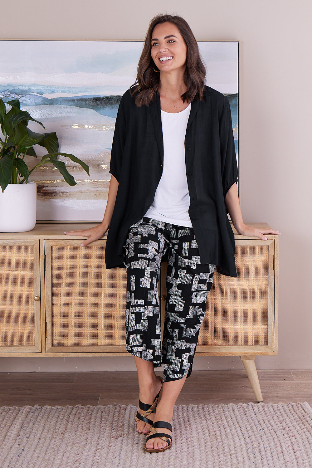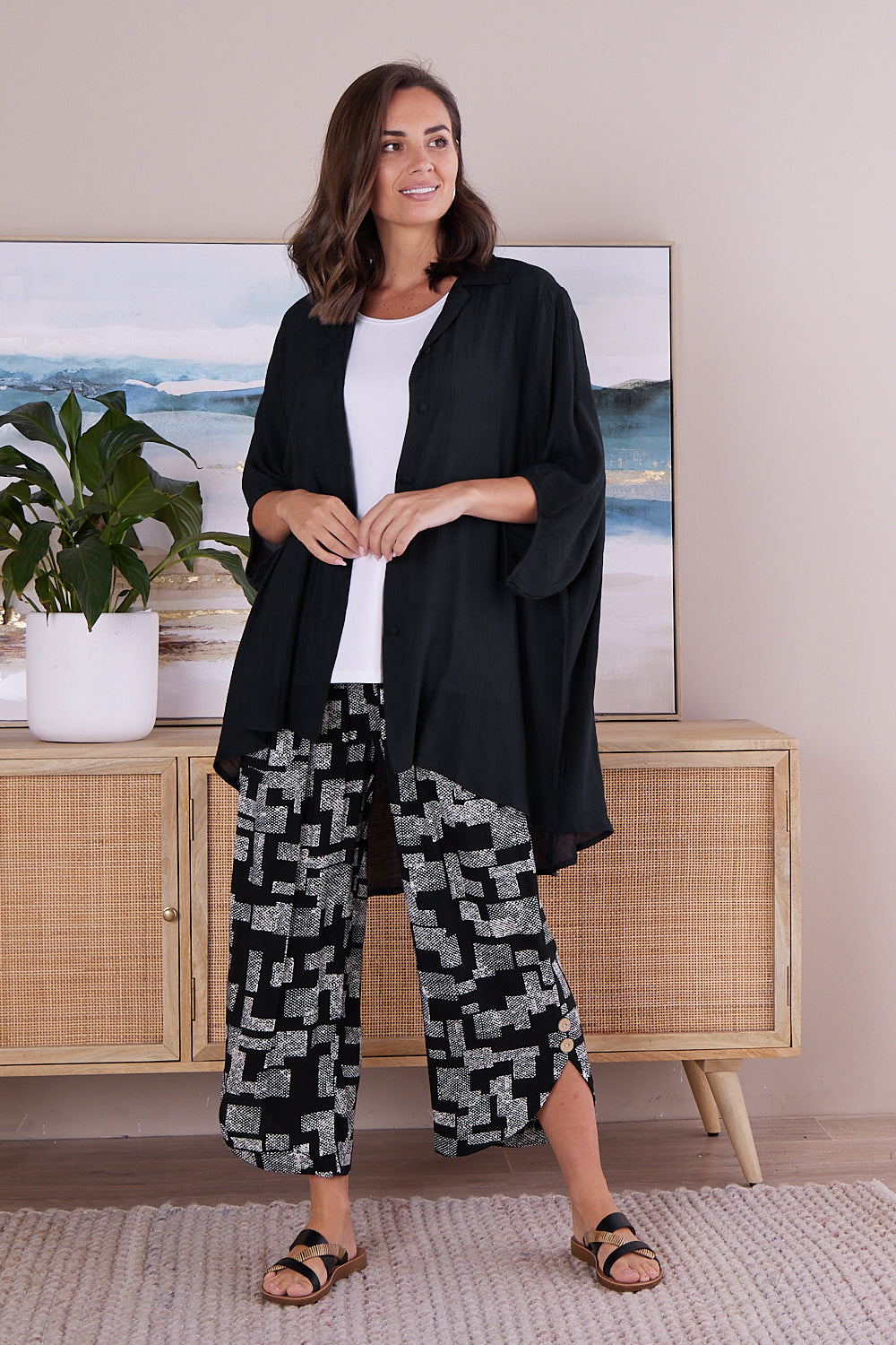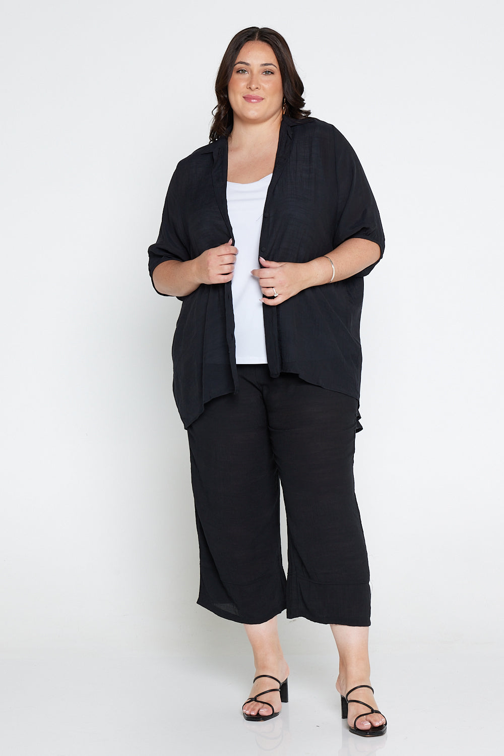 In timeless, sleek black, the comfort shirt is such a handy basic. Whether you button it to show off its longline, tunic silhouette, or leave it open to create the perfect lightweight warm-weather jacket, you will be comfortable and stylish. Cut from a cotton-rich, textured fabric, this shirt drapes effortlessly over the body. A beautiful canvas for accessories, there's nowhere this cool, breezy design won't come in handy.