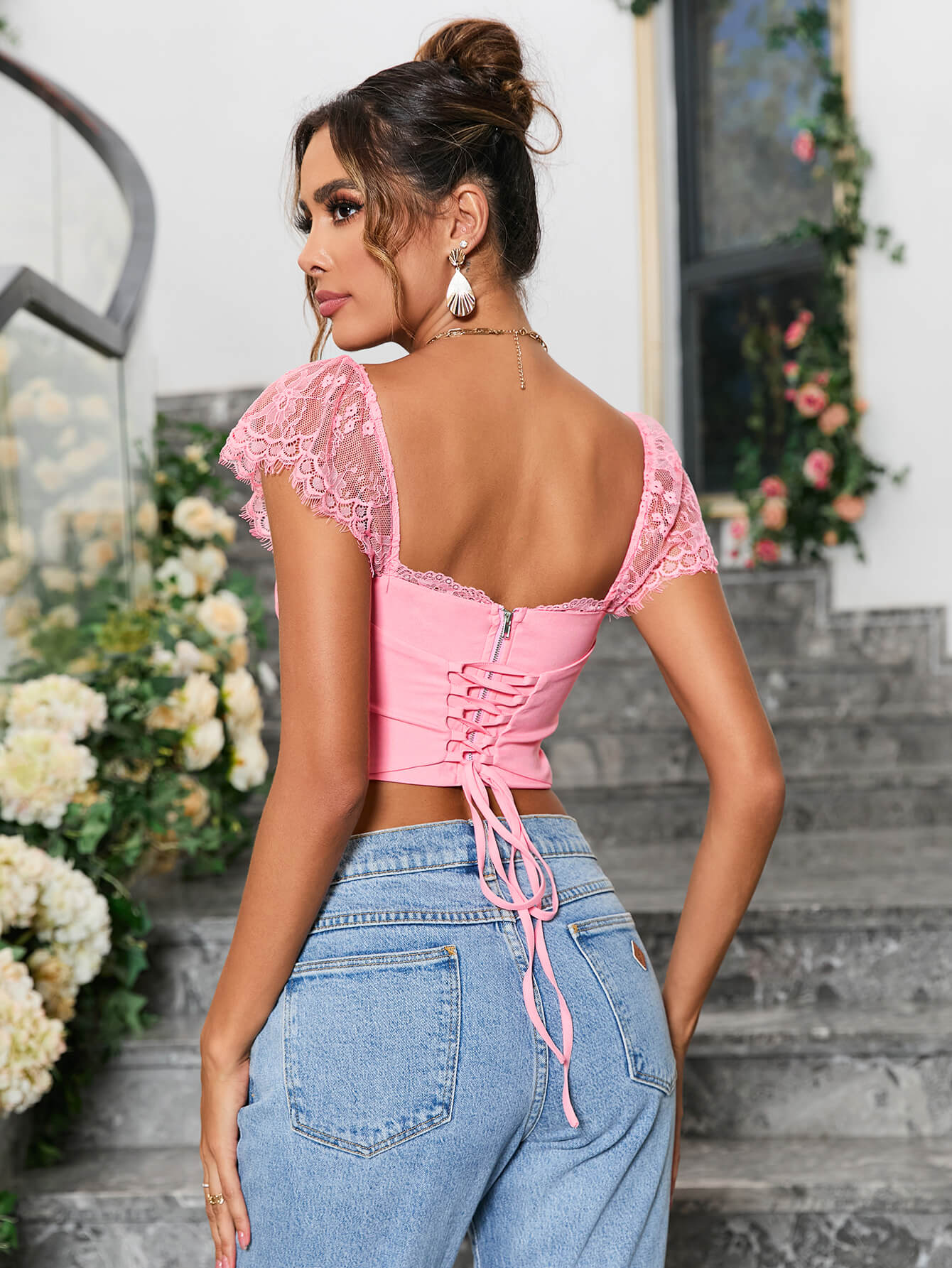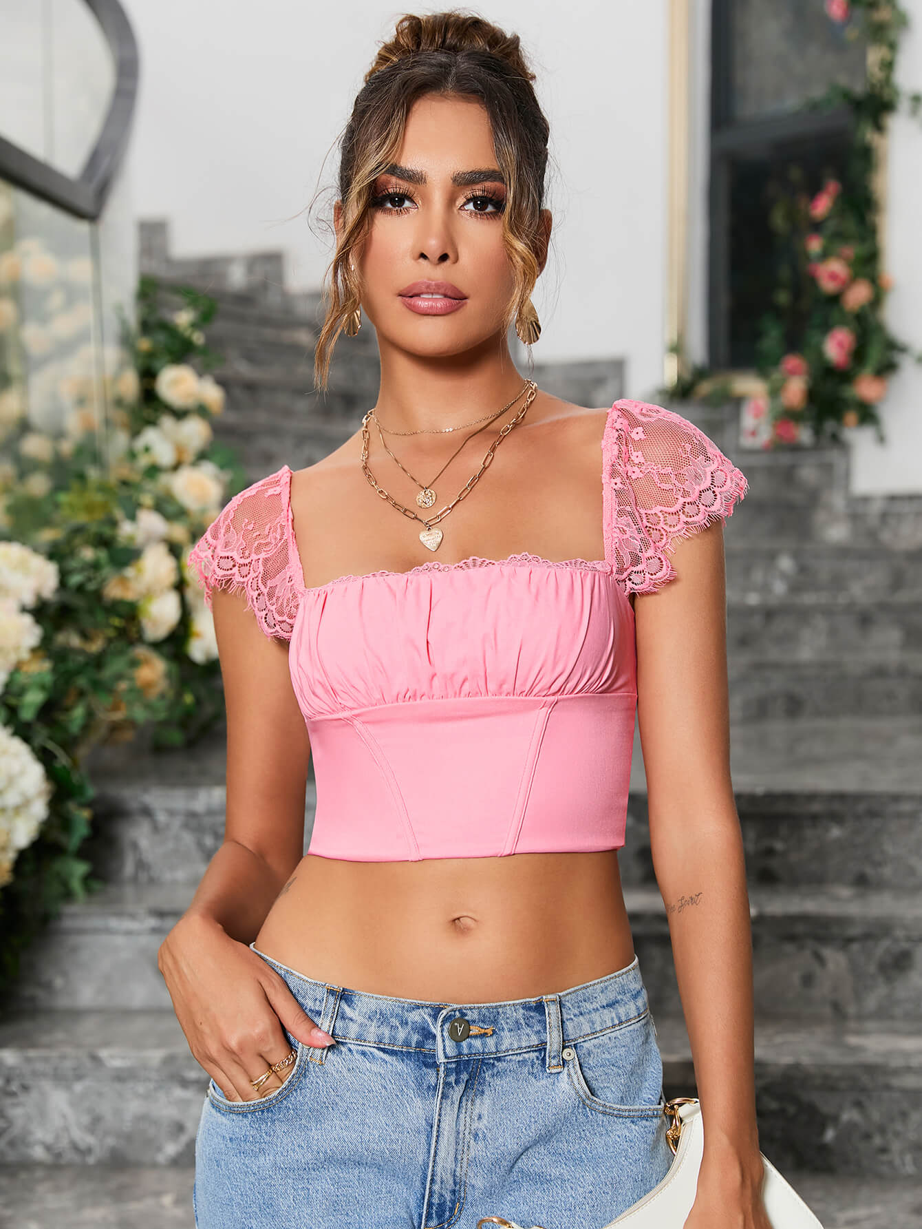 Contrast Lace Ruched Bust Square Neck Crop Top