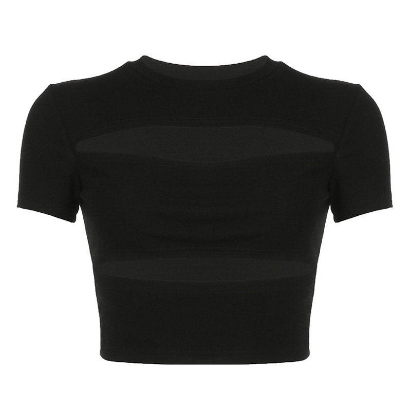 Crew Neck Split Cutout Front Short Sleeve Fitted Cropped Top - Black