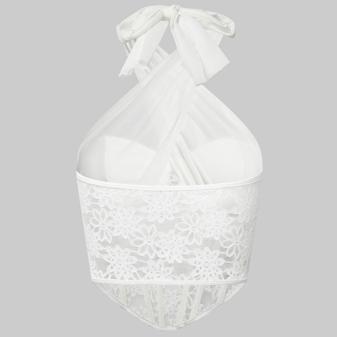 Crossed Halter Neck Lace Floral Mesh Cropped Corset Top - White