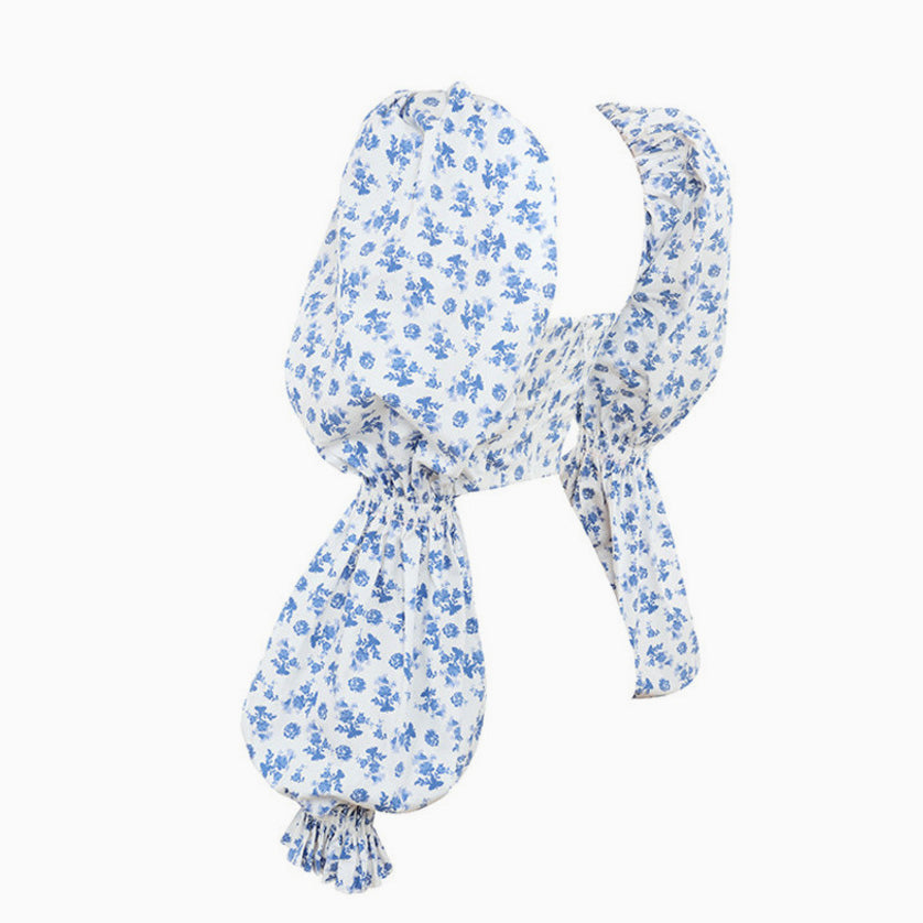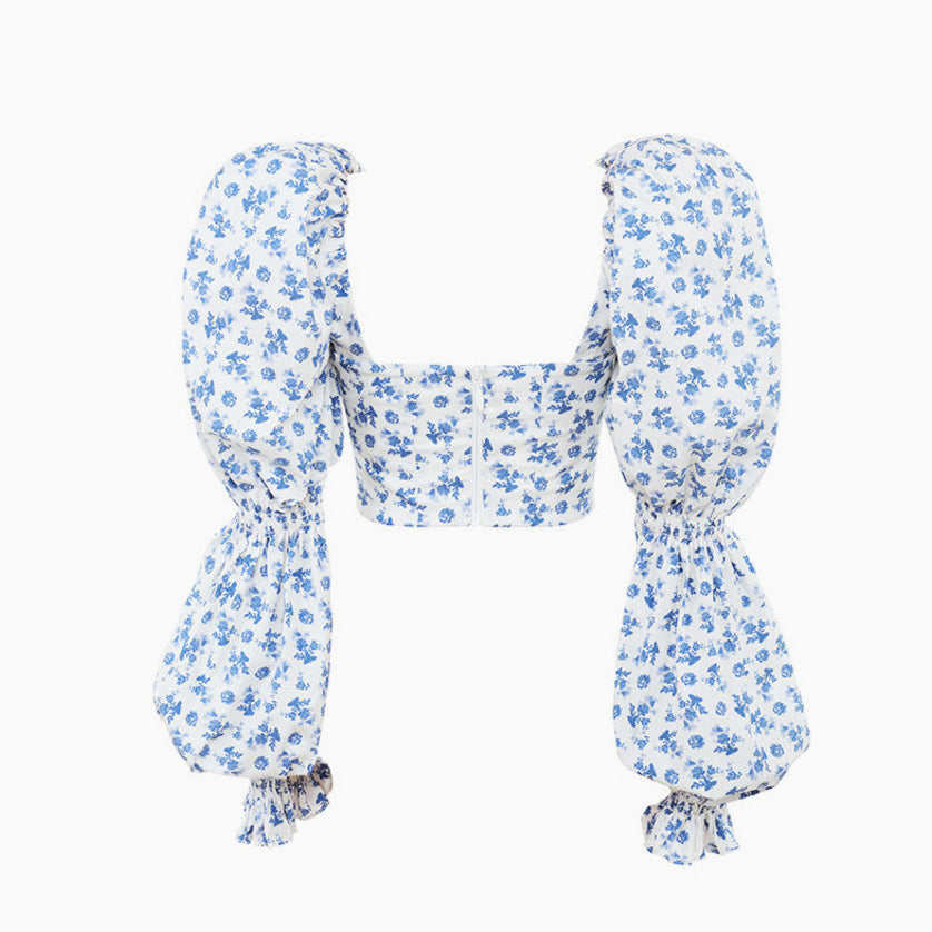 Cute Bustier Tied Front Floral Printed Puff Sleeve Crop Top - White