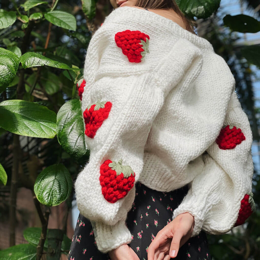 Cute Strawberry Studded Bishop Sleeve Button Up Cardigan - White