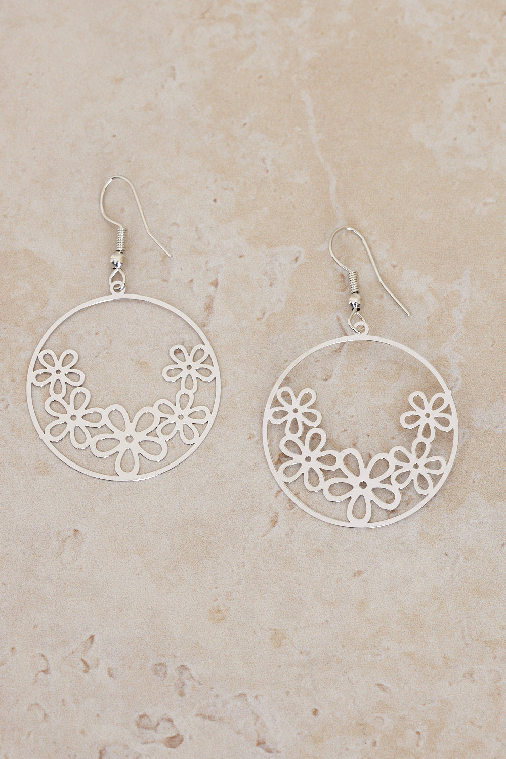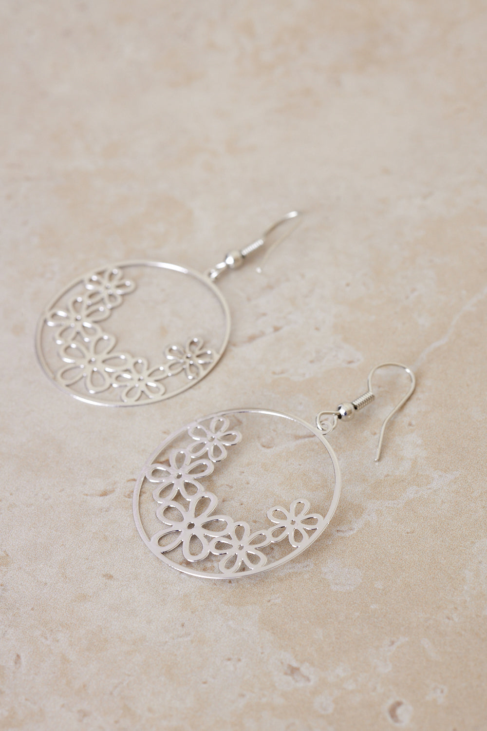 These silver-tone daisy drop earrings feature a delicate floral design within an open circular frame. The charming daisy motifs add a touch of whimsy, while the lightweight construction ensures comfortable wear all day long. Perfect for adding a subtle yet stylish accent to any outfit.