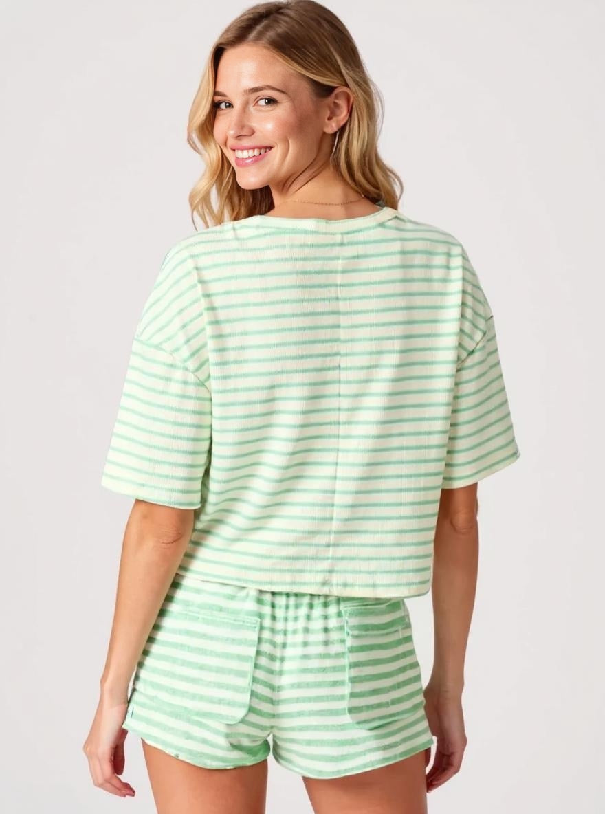Slip into our Darling Drape Two Piece Set in refreshing green stripes! This playful ensemble combines comfort with style, perfect for mixing and matching or wearing as a set. The breezy fabric drapes beautifully on your body, making it an effortless choice for casual outings or relaxed weekends. Add this versatile duo to your wardrobe for instant outfit magic!