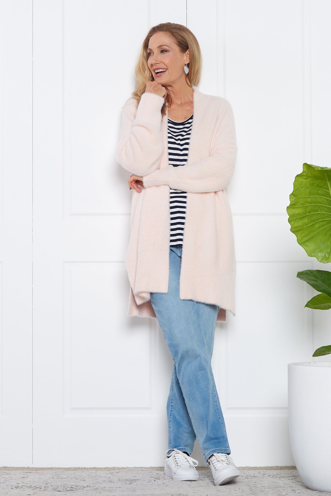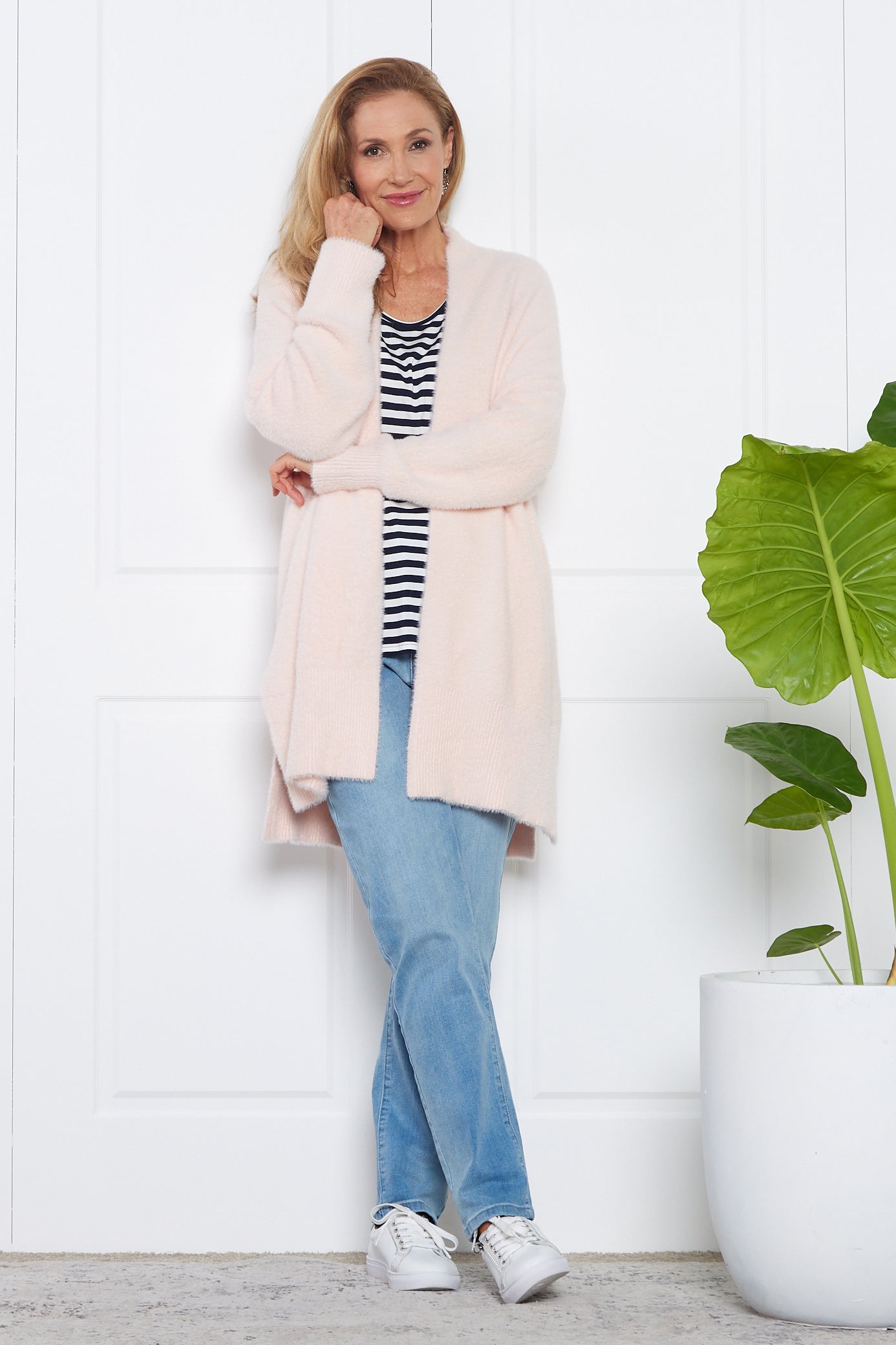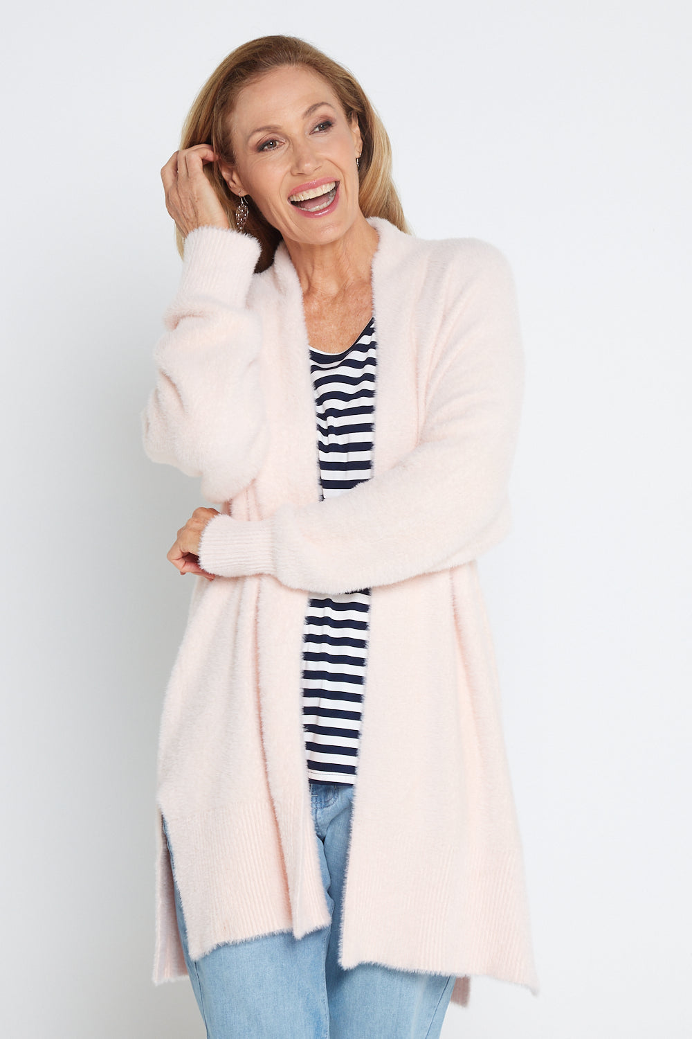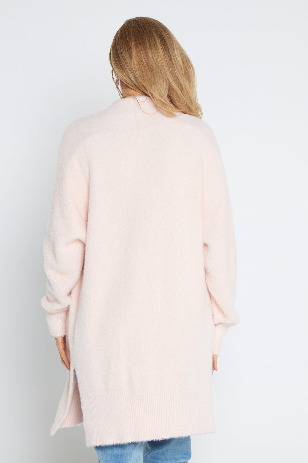 Embrace warmth with the Dawn Fluffy Knit Cardi in a soft pink. This cardigan boasts an open front design and long sleeves, ideal for layering. Small side splits add a stylish touch, while the fluffy texture provides ultimate comfort. Perfect for cooler days, this versatile cardigan is a must-have for any wardrobe, offering both sophistication and coziness. Pair it with your go-to jeans or leggings for a relaxed yet chic look.