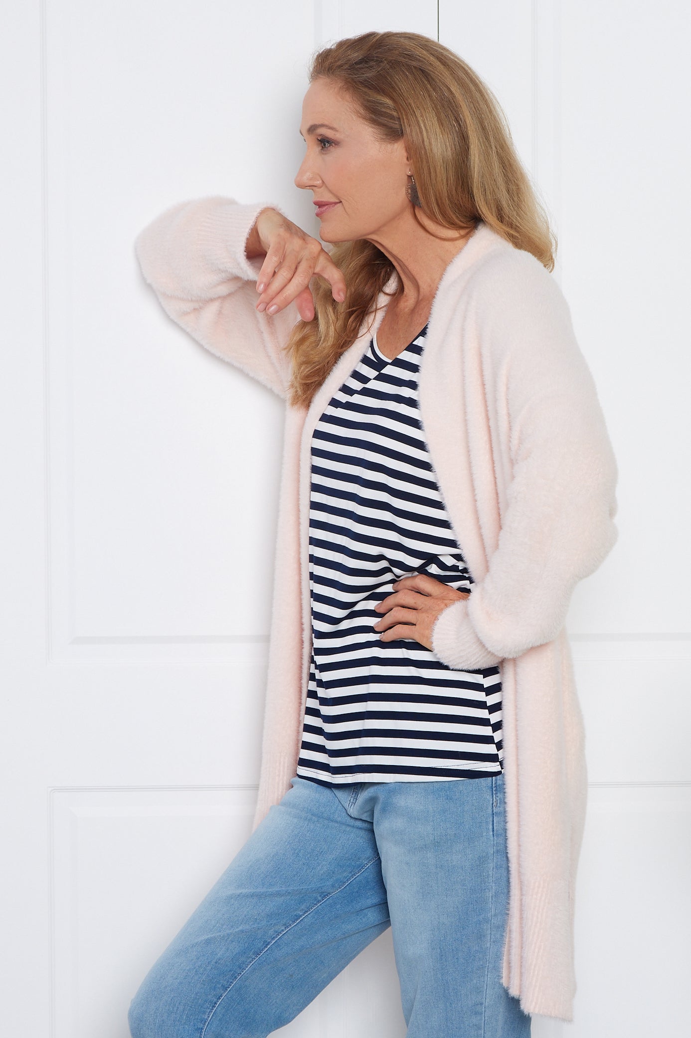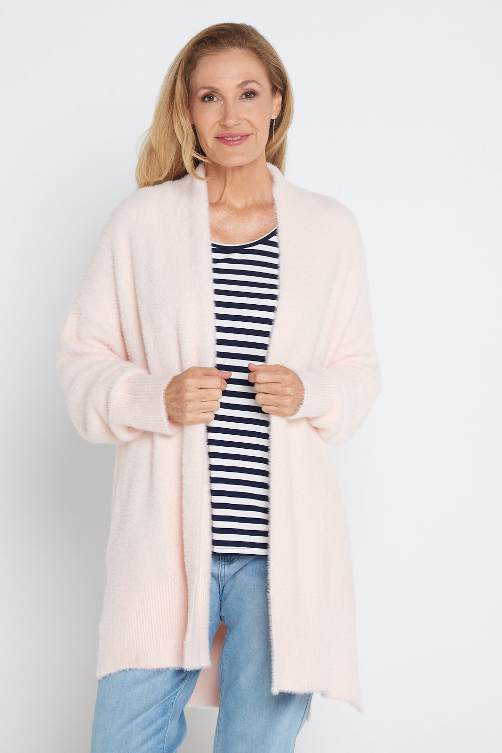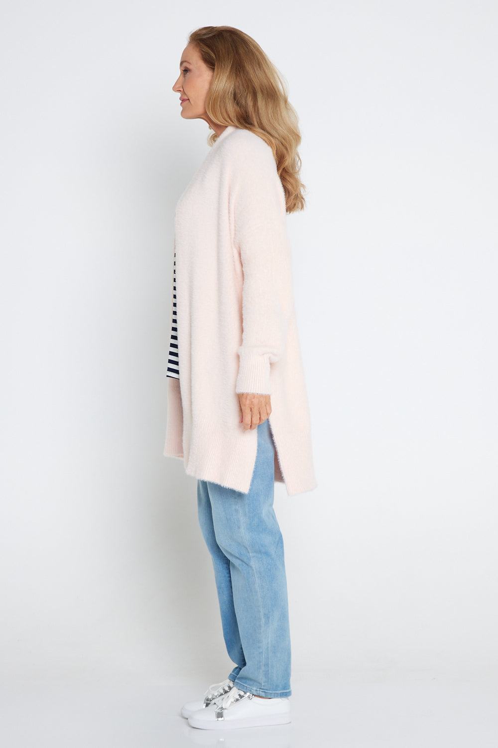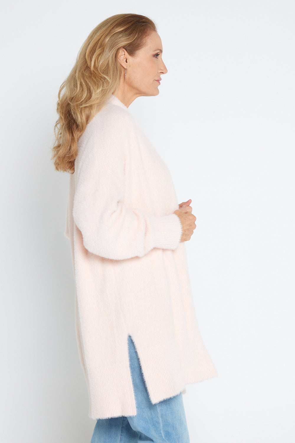 Embrace warmth with the Dawn Fluffy Knit Cardi in a soft pink. This cardigan boasts an open front design and long sleeves, ideal for layering. Small side splits add a stylish touch, while the fluffy texture provides ultimate comfort. Perfect for cooler days, this versatile cardigan is a must-have for any wardrobe, offering both sophistication and coziness. Pair it with your go-to jeans or leggings for a relaxed yet chic look.