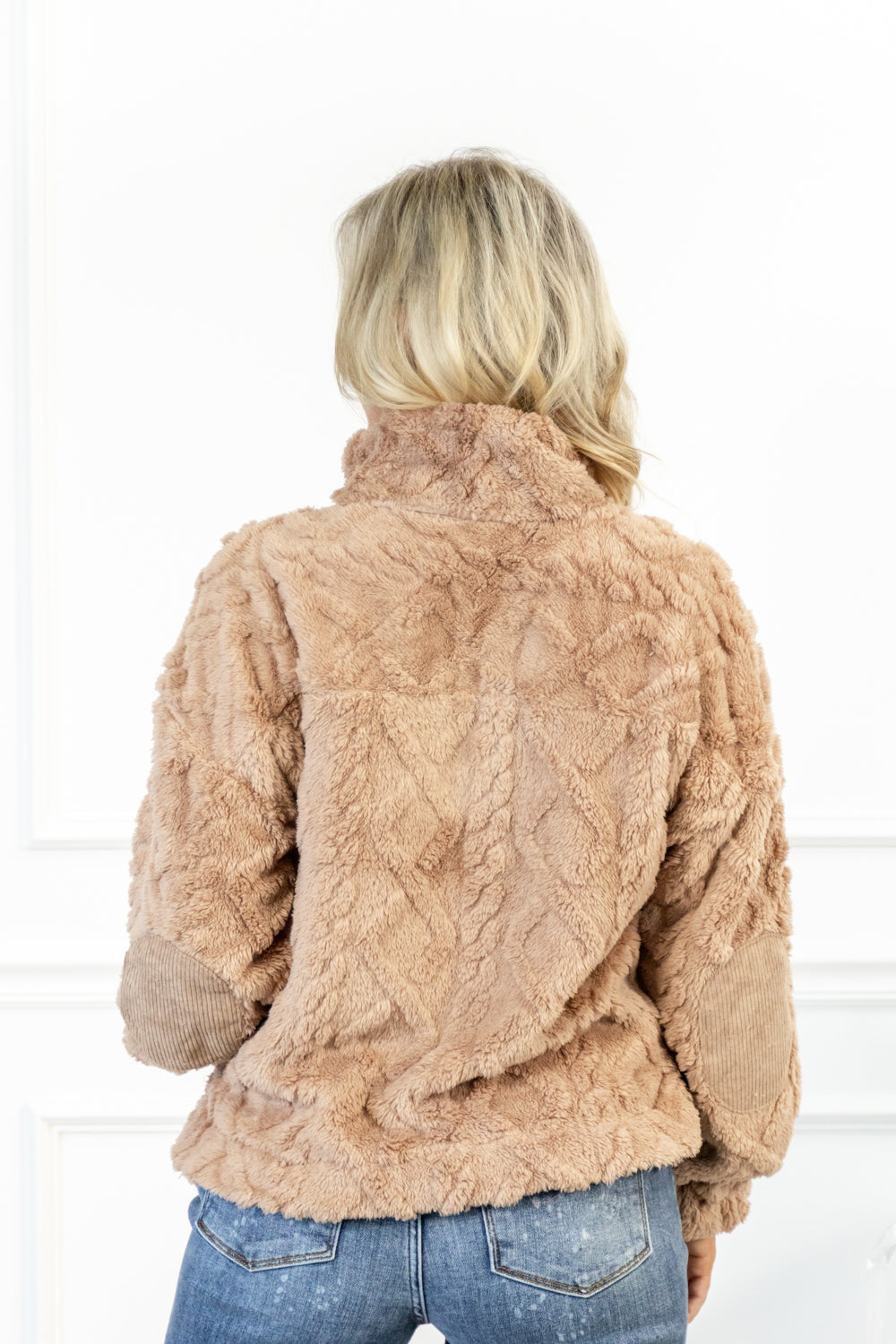 Stay cozy and stylish all season long with this fuzzy fleece pullover. The cable knit pattern and corduroy elbow patches add a touch of classic charm, while the mock neck and half zip-up design offer customizable warmth. The relaxed fit ensures comfort and ease of movement, making this the perfect piece for layering or wearing on its own.