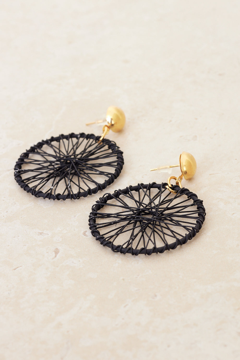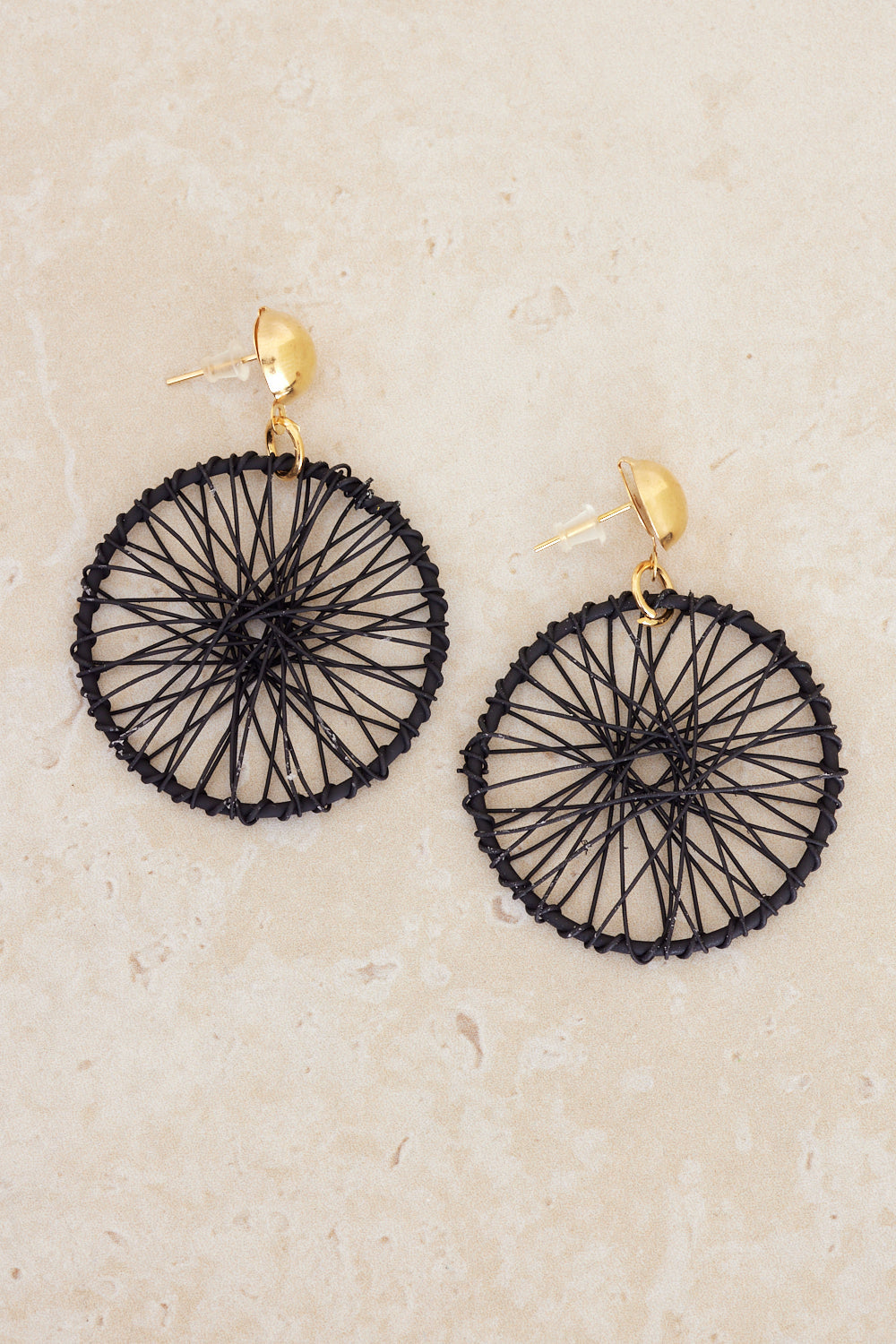 Add a touch of bohemian charm to your look with our Dreamcatcher Web Earrings in classic black. These statement earrings feature an intricate web design, wrapped in sleek black thread, creating a unique and eye-catching accessory. The gold tone stud adds a touch of elegance, making these earrings perfect for both casual and formal occasions. Lightweight and comfortable, they are a must-have addition to your jewellery collection.