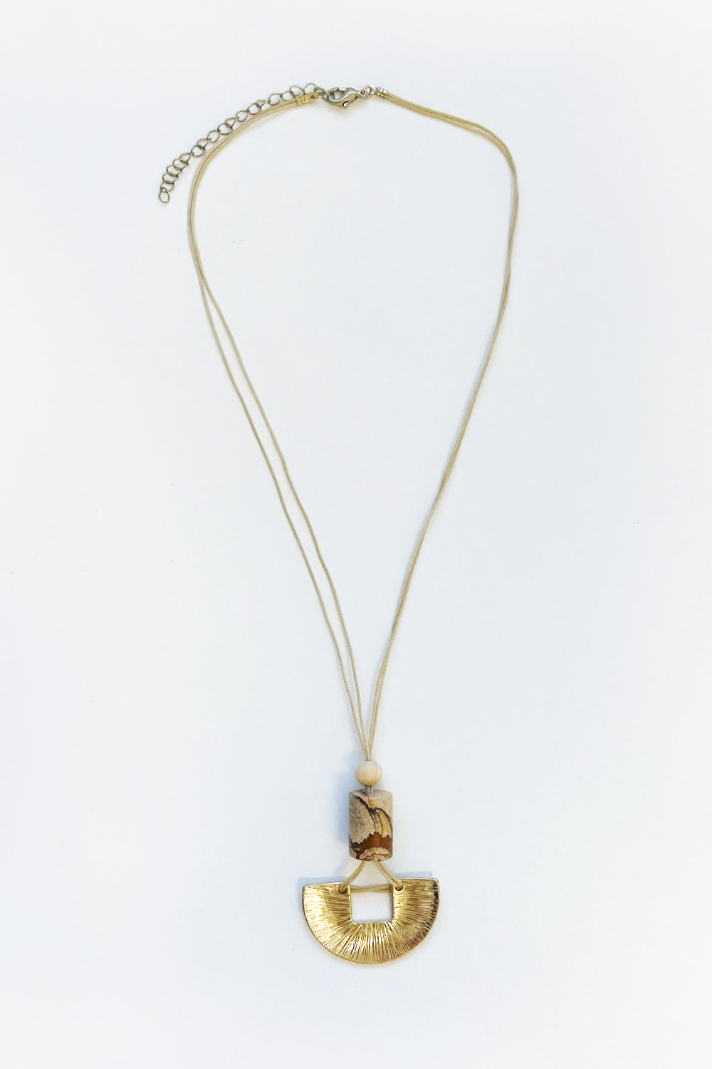 Step into a world of natural beauty with our Earth Tone Necklace, featuring a unique combination of a textured gold half-moon pendant and a rustic bead, all elegantly suspended from a soft beige cord. This bohemian-inspired necklace perfectly captures the essence of artisan craftsmanship, making it an ideal accessory for those who appreciate the allure of organic and geometric design elements. Versatile and striking, this necklace adds a touch of earthy charm to any ensemble, seamlessly blending with both casual and sophisticated styles. Elevate your accessory game with this enchanting piece, meticulously designed for the modern boho chic.