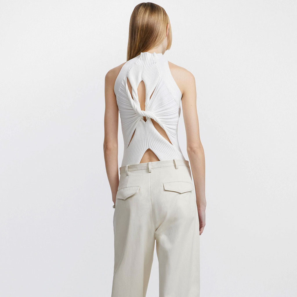 Edgy Twisted CutOut Front High Neck Racer Back Ribbed Knit Tank Top - White