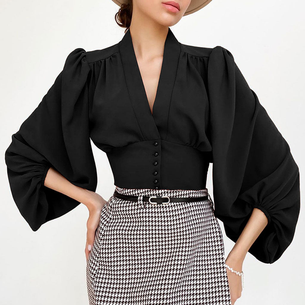 Elegant Solid Ruched Lantern Sleeve V Neck Button Up Cropped Chiffon Blouse