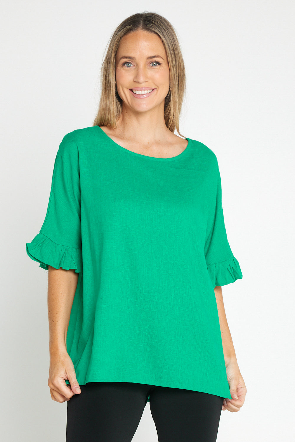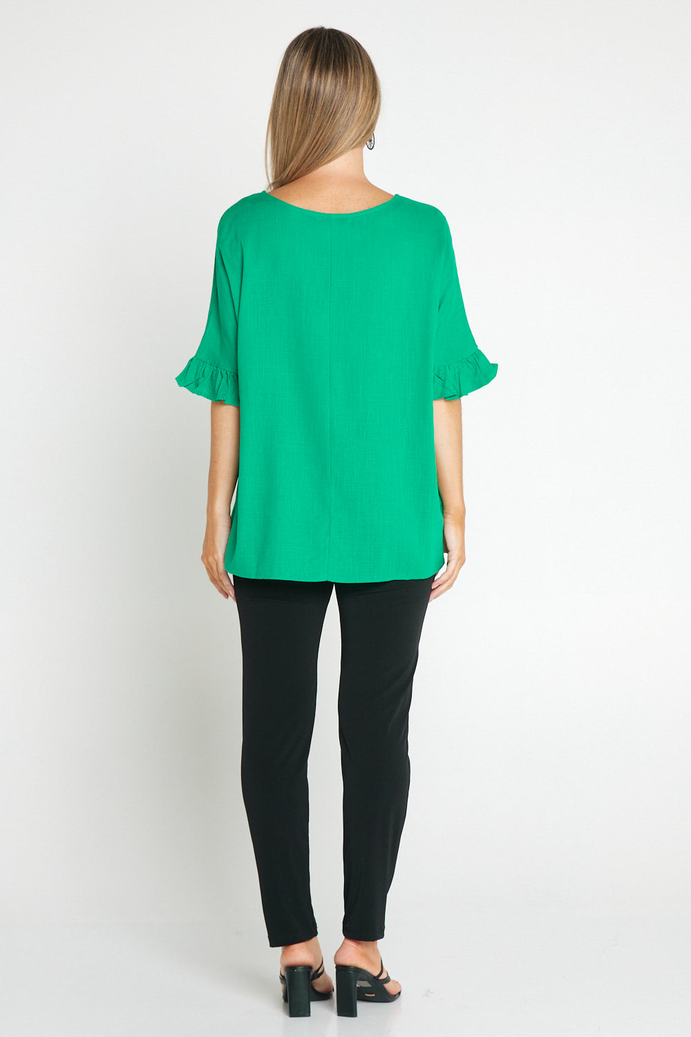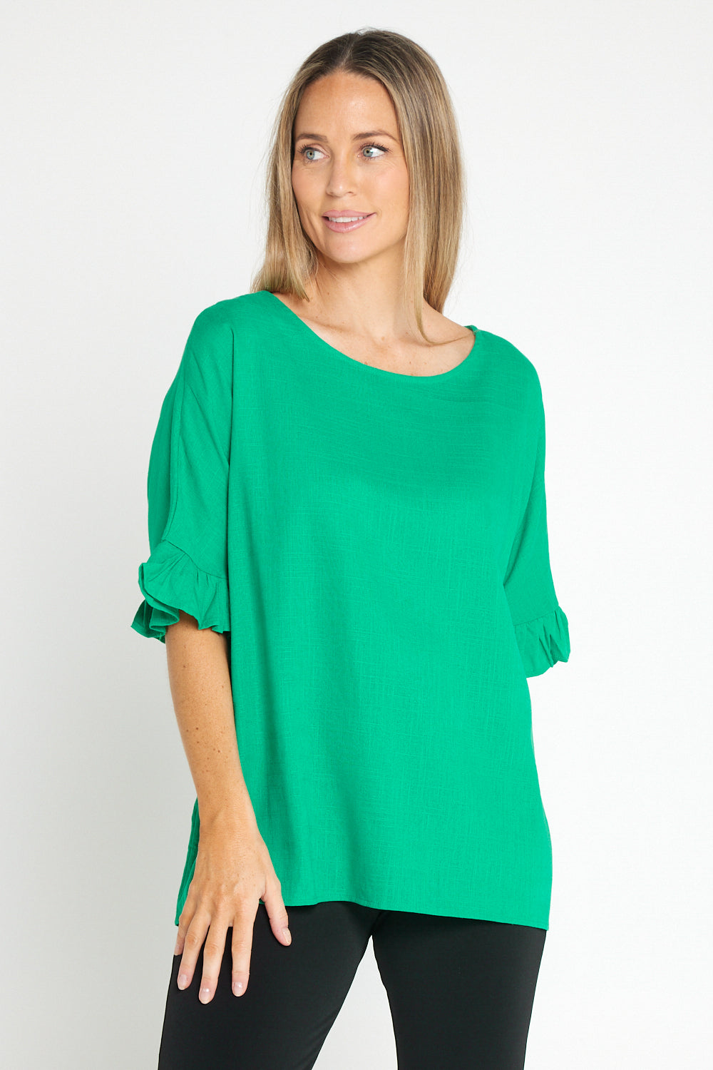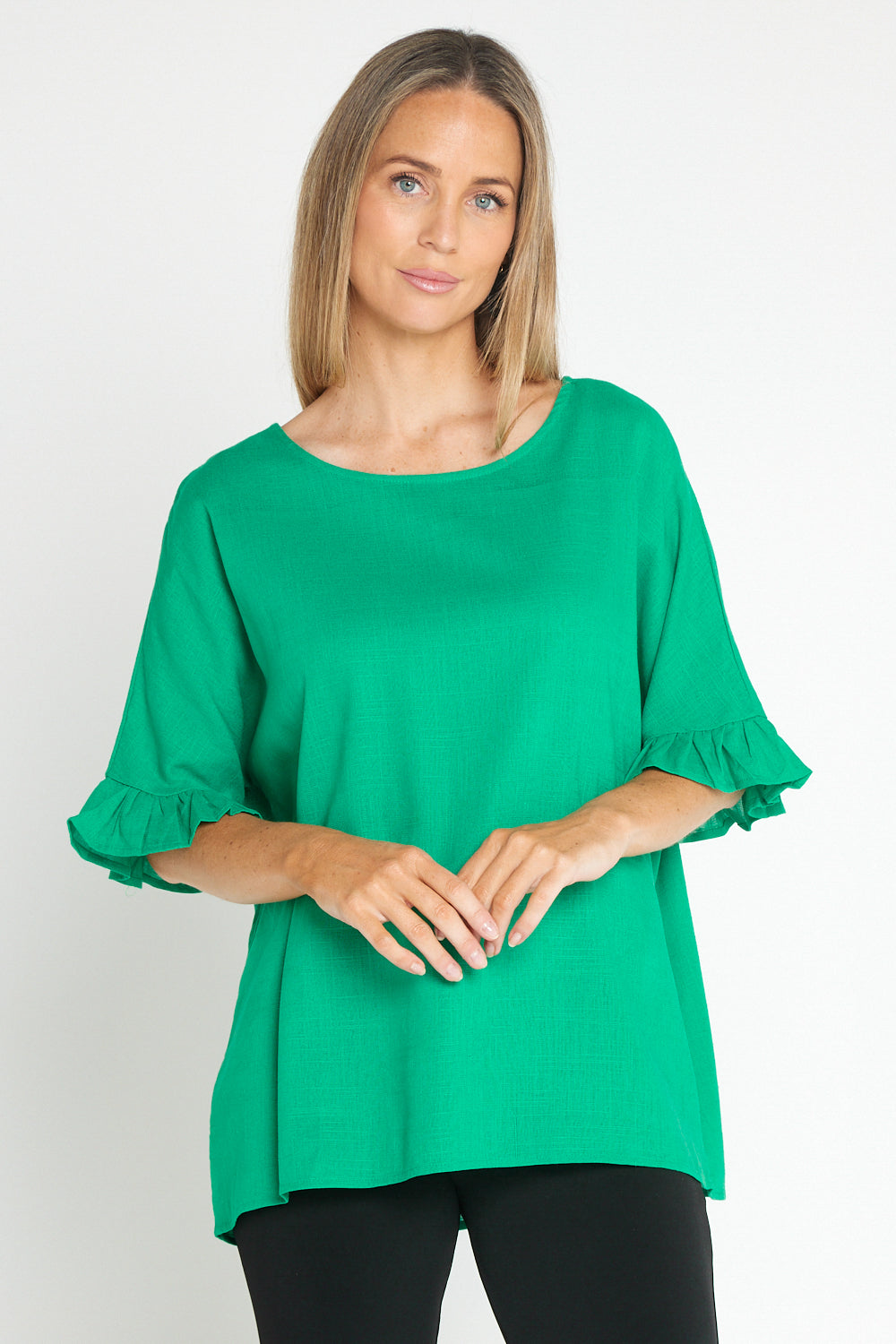 Elevate your wardrobe with this eye-catching top! The ruffled sleeves add a touch of femininity and movement, perfect for pairing with neutral pants or your favourite jeans. Embrace effortless style with a top that’s as bold as it is comfortable.