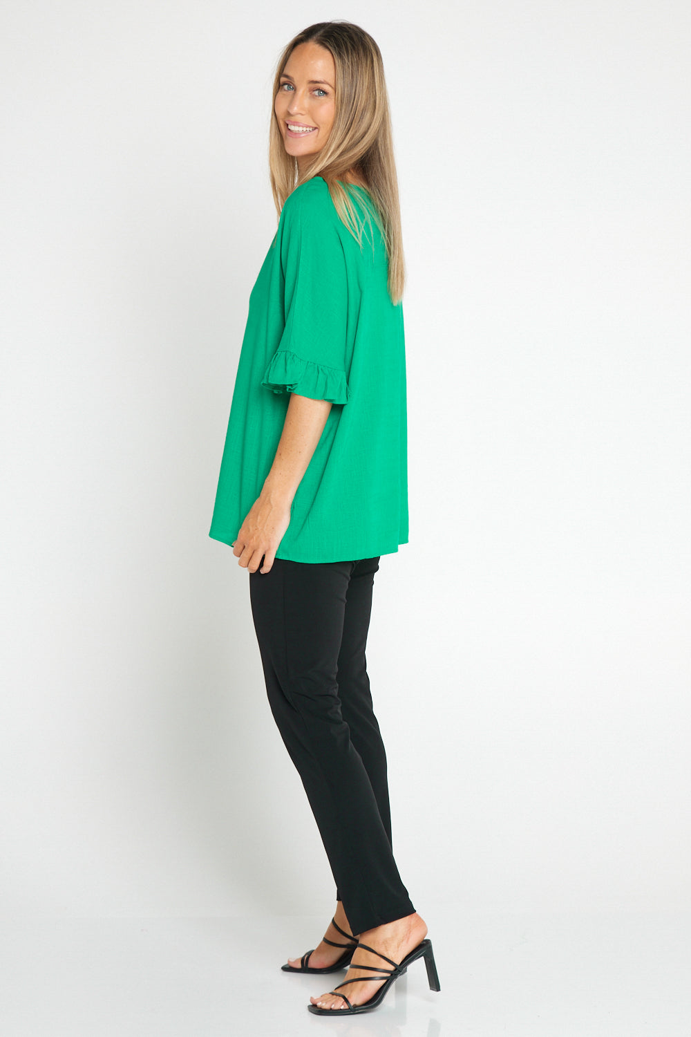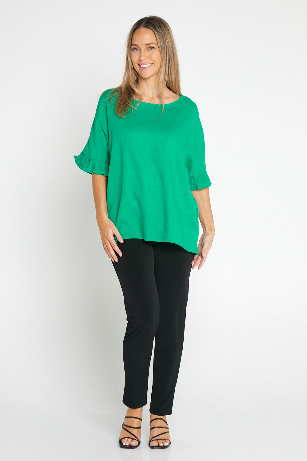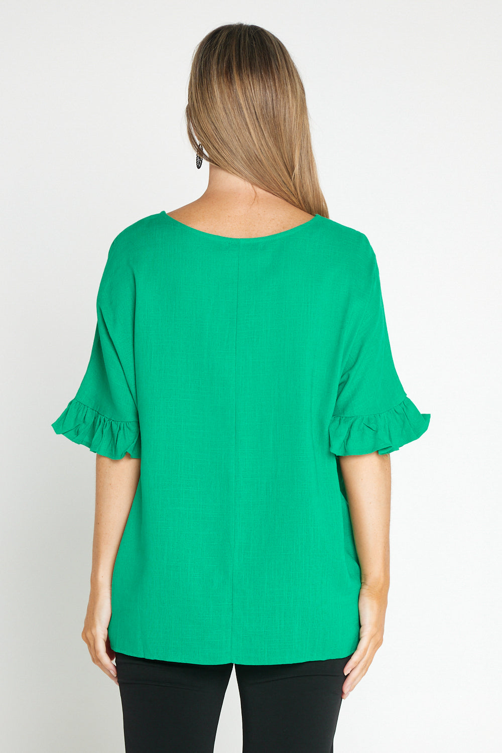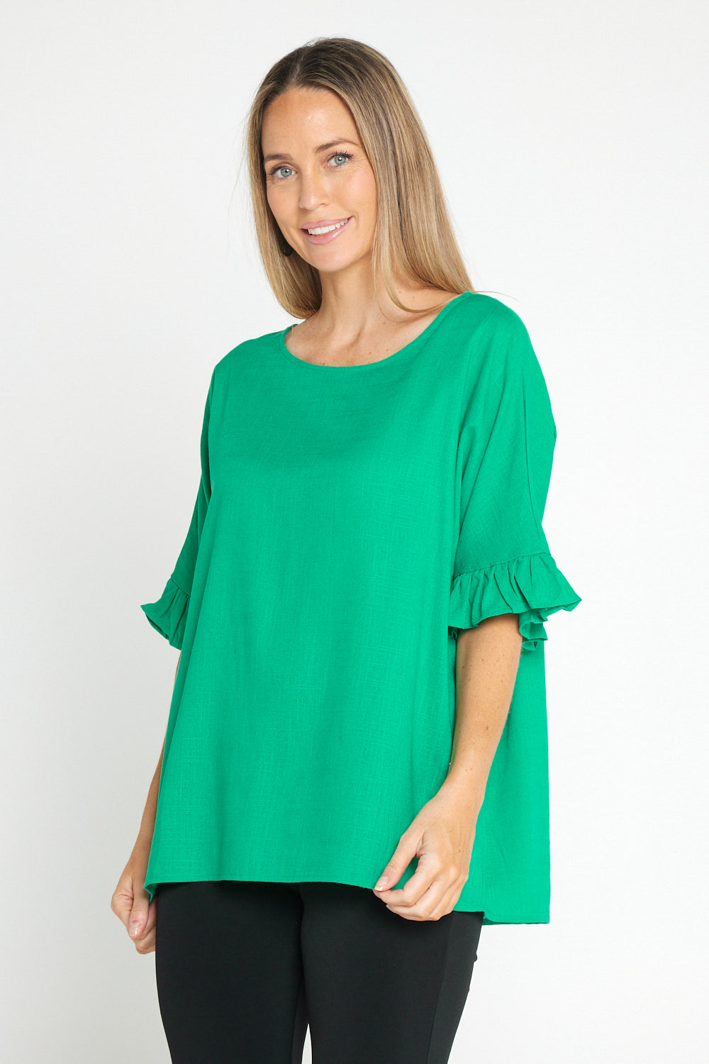 Elevate your wardrobe with this eye-catching top! The ruffled sleeves add a touch of femininity and movement, perfect for pairing with neutral pants or your favourite jeans. Embrace effortless style with a top that’s as bold as it is comfortable.
