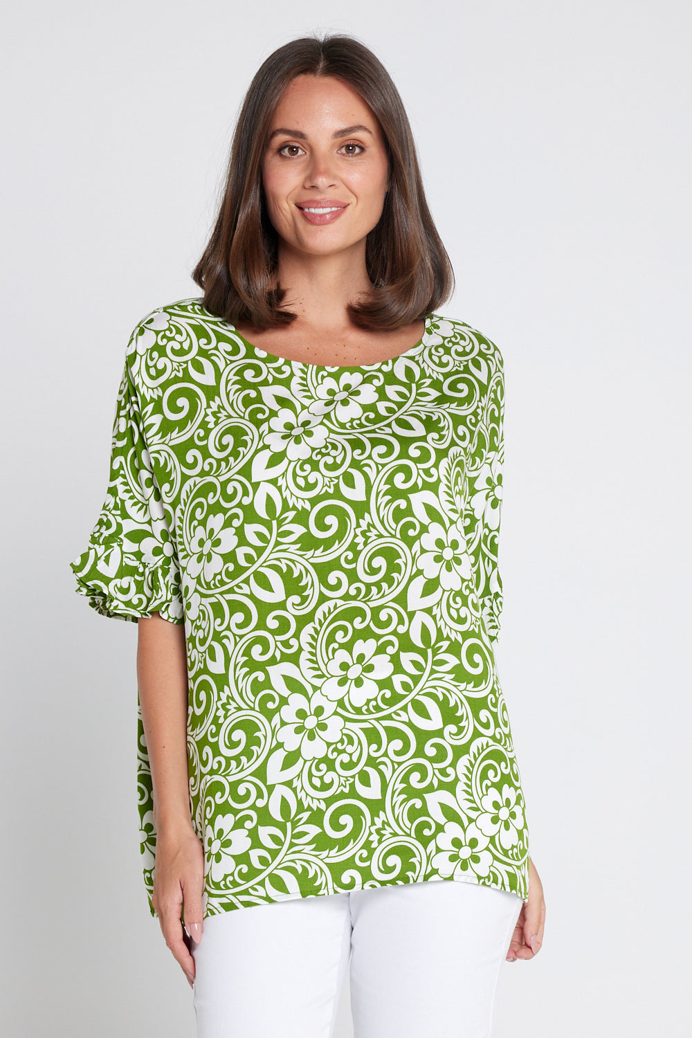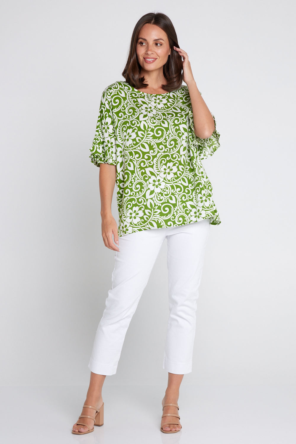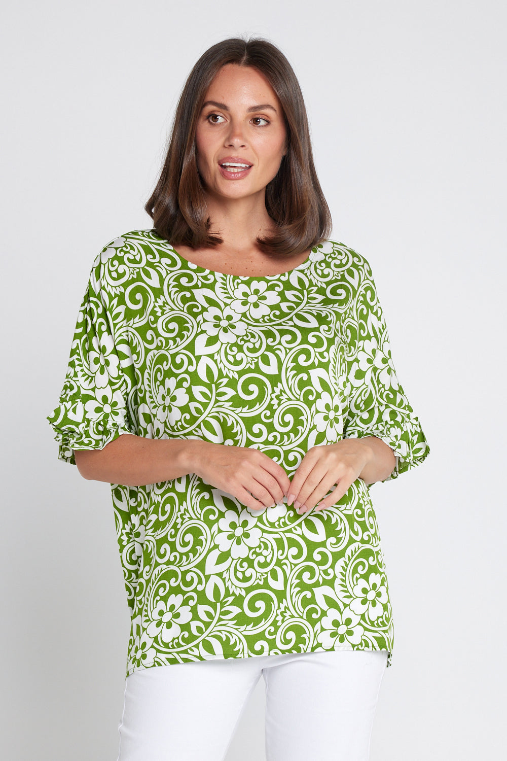 Elevate your wardrobe with this eye-catching top! The ruffled sleeves add a touch of femininity and movement, perfect for pairing with neutral pants or your favourite jeans. Embrace effortless style with a top that’s as bold as it is comfortable.