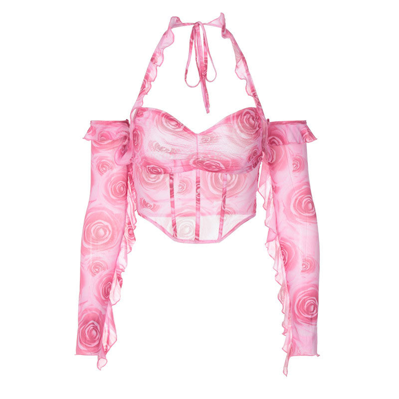 Floral Print Ruched Detail Cold Shoulder Halter Corset Crop Top - Pink